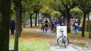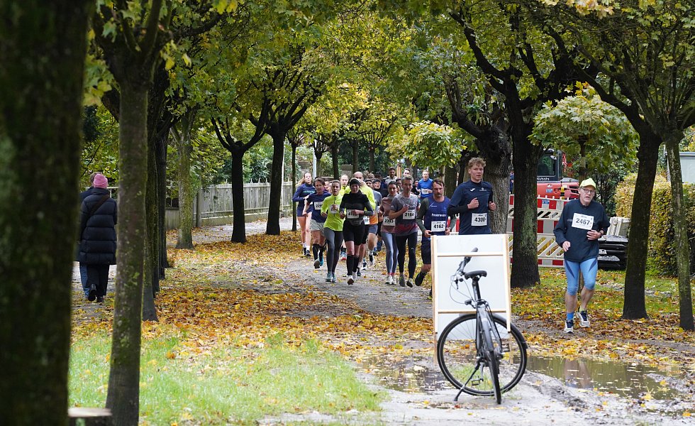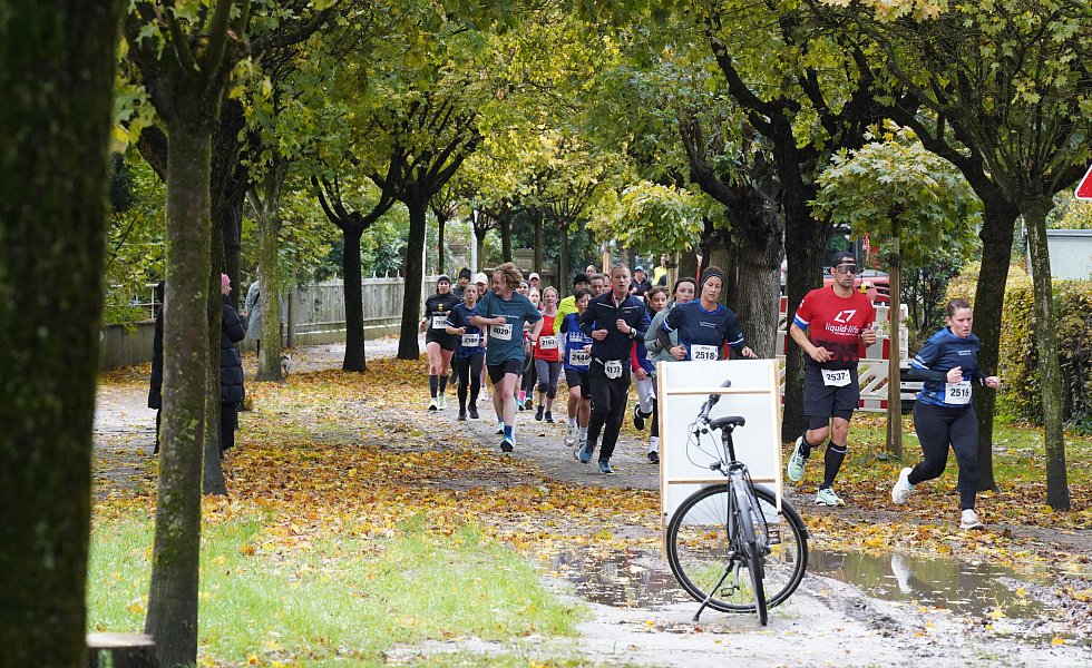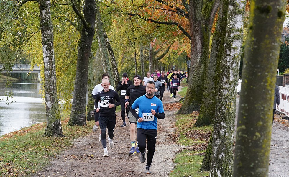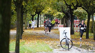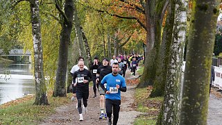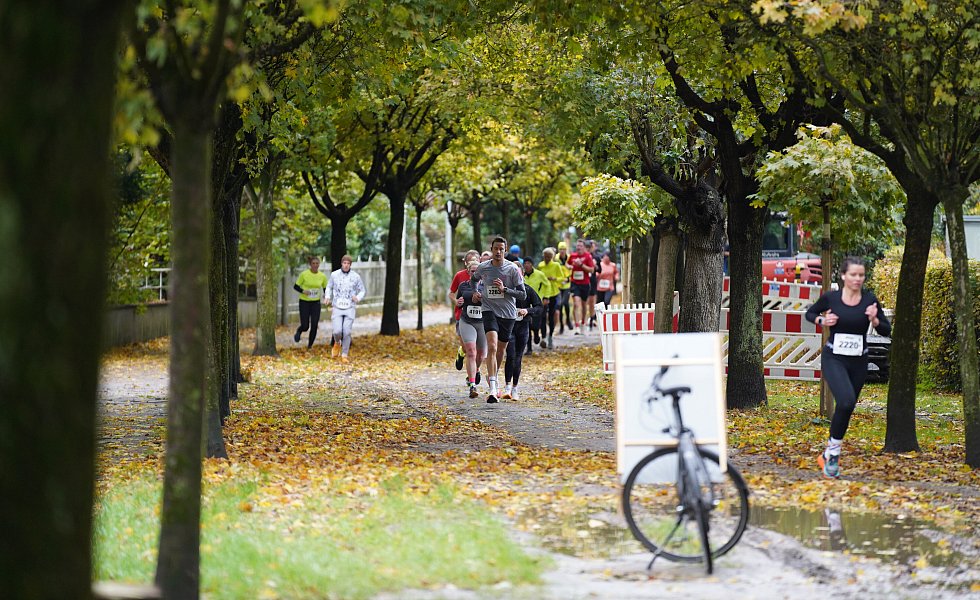 Die Starter des Firmenlaufs sind unter dem bunten Blätterdach an der Werre unterwegs