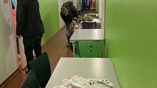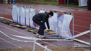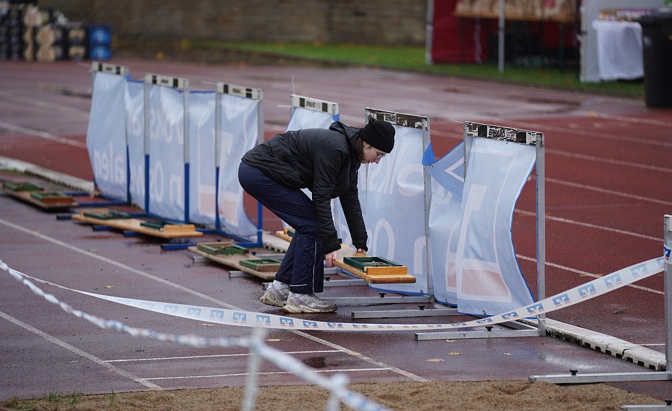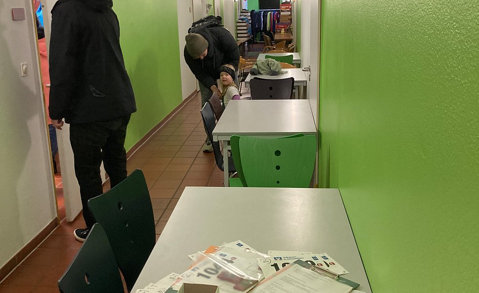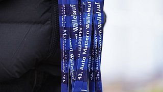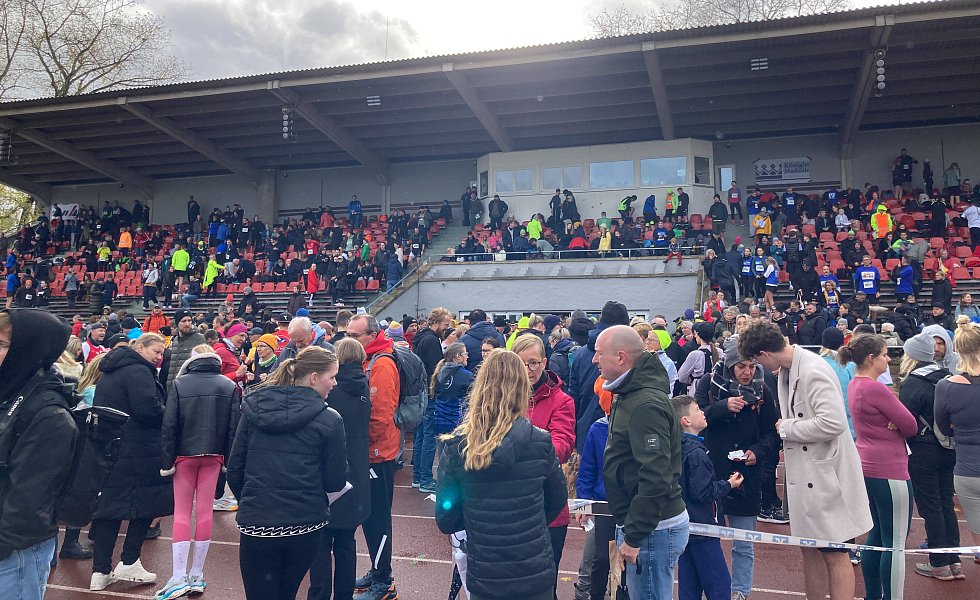 Lange Schlangen: Die Startnummernausgabe wurde wegen des Wetters in die Sprecherkabine verlegt. Links anstellen, Nummer oben abholen und rechts wieder runter.