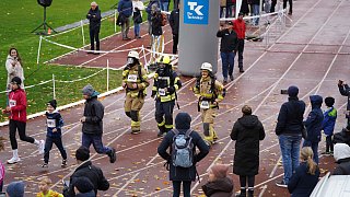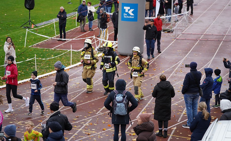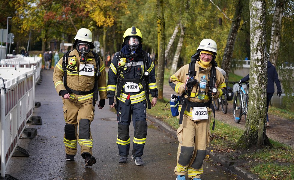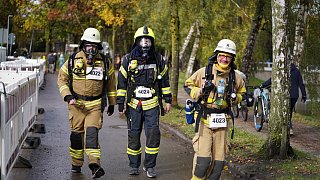 Die Fire Fighter's Stefan Bender (v.l.), Markus und Thomas Finkemeyer gehen die 6,8 Kilometer Rund ein voller Montur und teilweise unter Atemschutz.