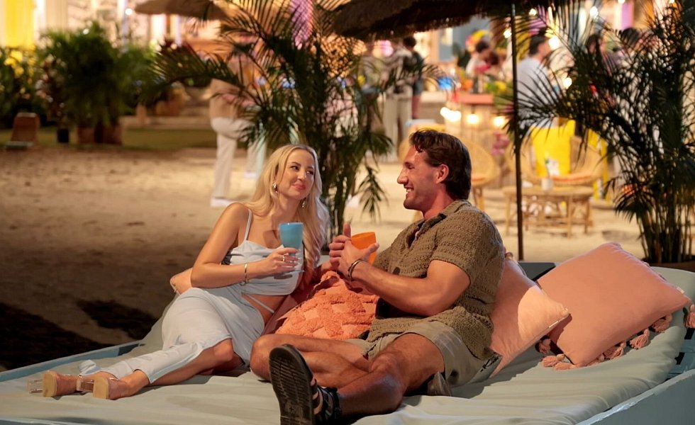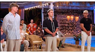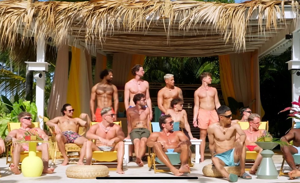 Diese 20 Männer sind bei der ersten Staffel von "FBoy Island" mit dabei. Zehn von ihnen sind nur wegen des Geldes dabei, die anderen suchen (angeblich) die große Liebe. Nach und nach kommen zudem immer mal wieder weitere Mitstreiter hinzu. Finn (2. v. l.) und Kenan (r.) geraten ins Visier von Lukas (vorne 3. v. r).