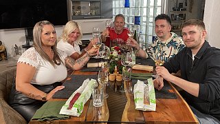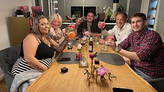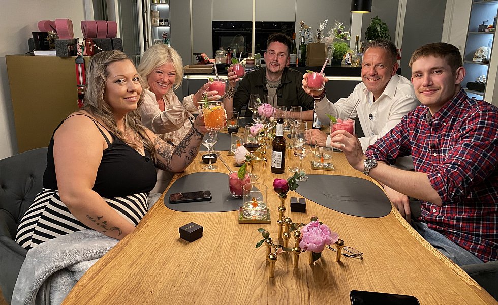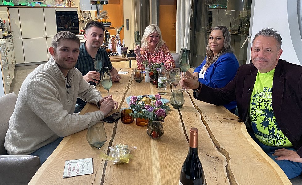 Am dritten Tag der "OWL-Woche" sind die Kandidaten bei Steffi (M.) aus Herford zu Gast. Sie serviert Morris (v. l.) aus Bünde, Marc aus Steinhagen, István aus Spenge und Betty aus Herford unter anderem russische Teigtaschen.