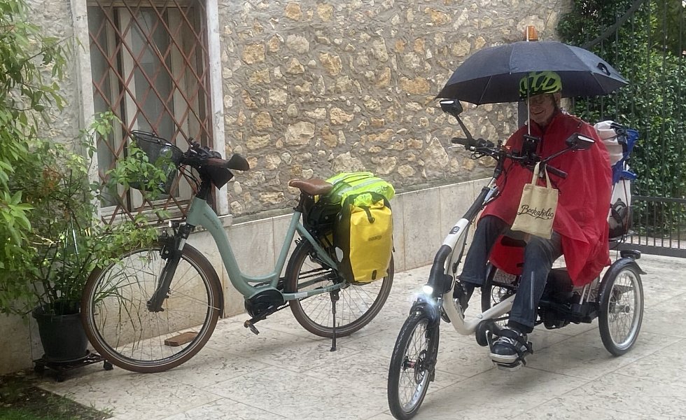 Der Easy Rider ist ein Therapie-Dreirad, das genauso funktioniert wie ein E-Bike. Durch seine Breite ist es allerdings nicht so wendig und manchmal wird's bei Durchgängen auch mal ein bisschen eng.
