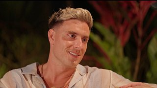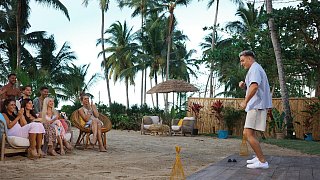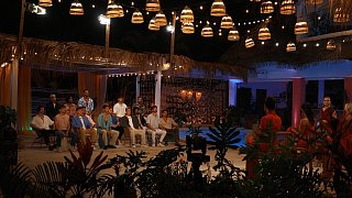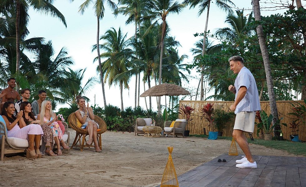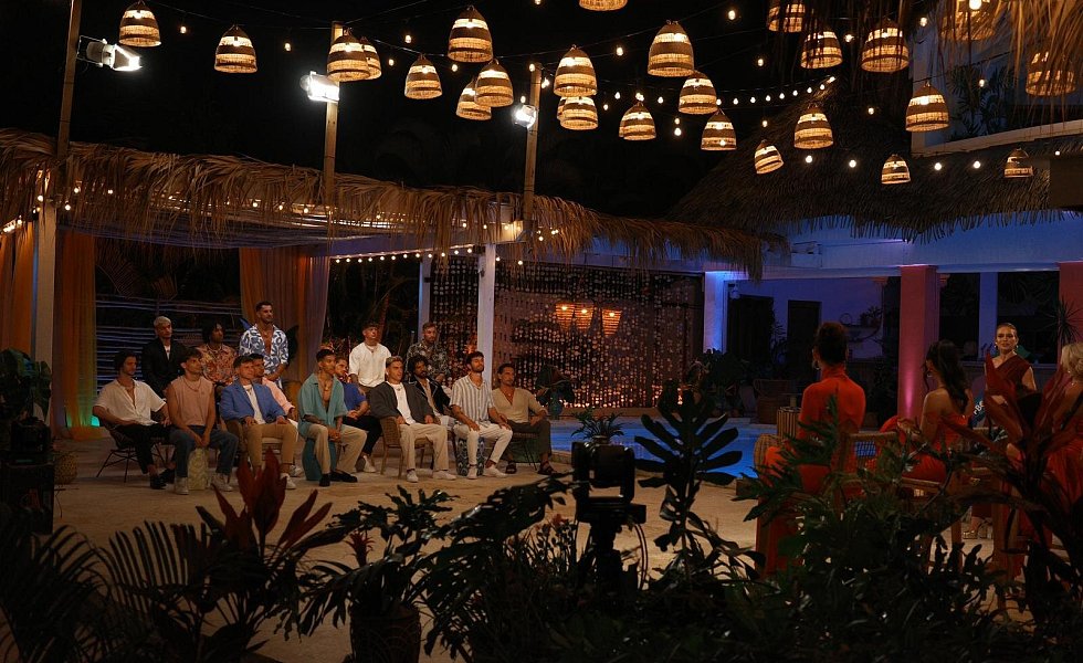 Diese 20 Männer sind bei der ersten Staffel von "FBoy Island" mit dabei. Zehn von ihnen sind nur wegen des Geldes dabei, die anderen suchen (angeblich) die große Liebe. Nach und nach kommen zudem immer mal wieder weitere Mitstreiter hinzu. Finn (2. v. l.) und Kenan (r.) geraten ins Visier von Lukas (vorne 3. v. r).