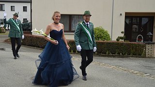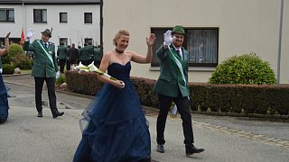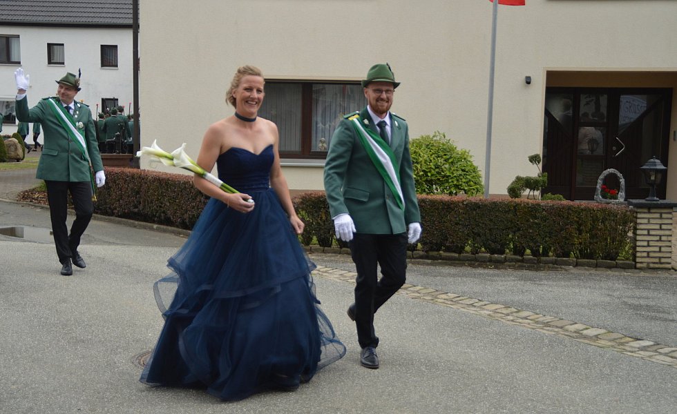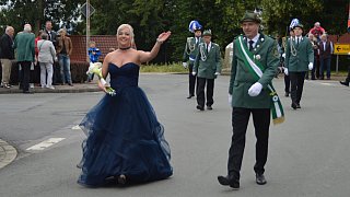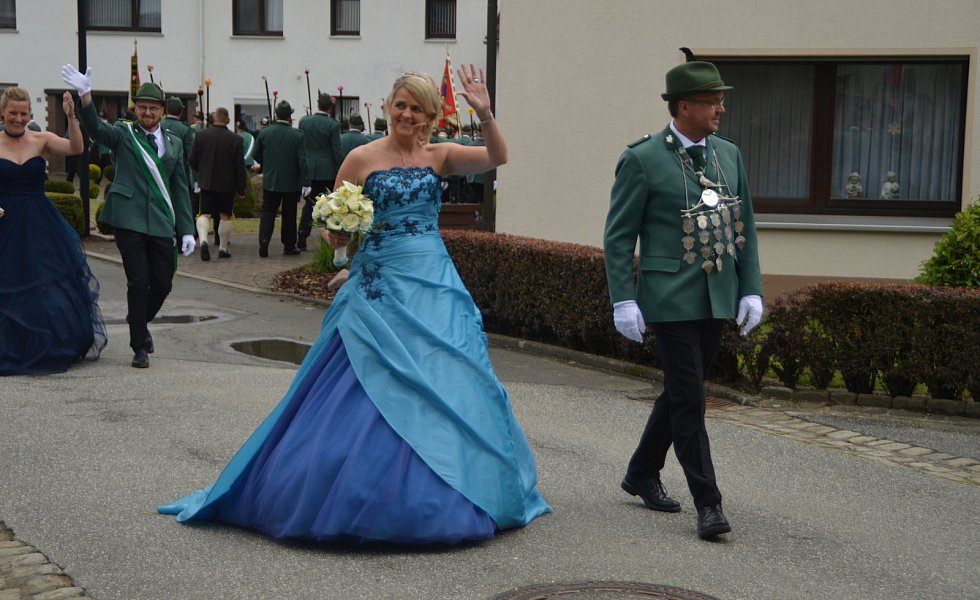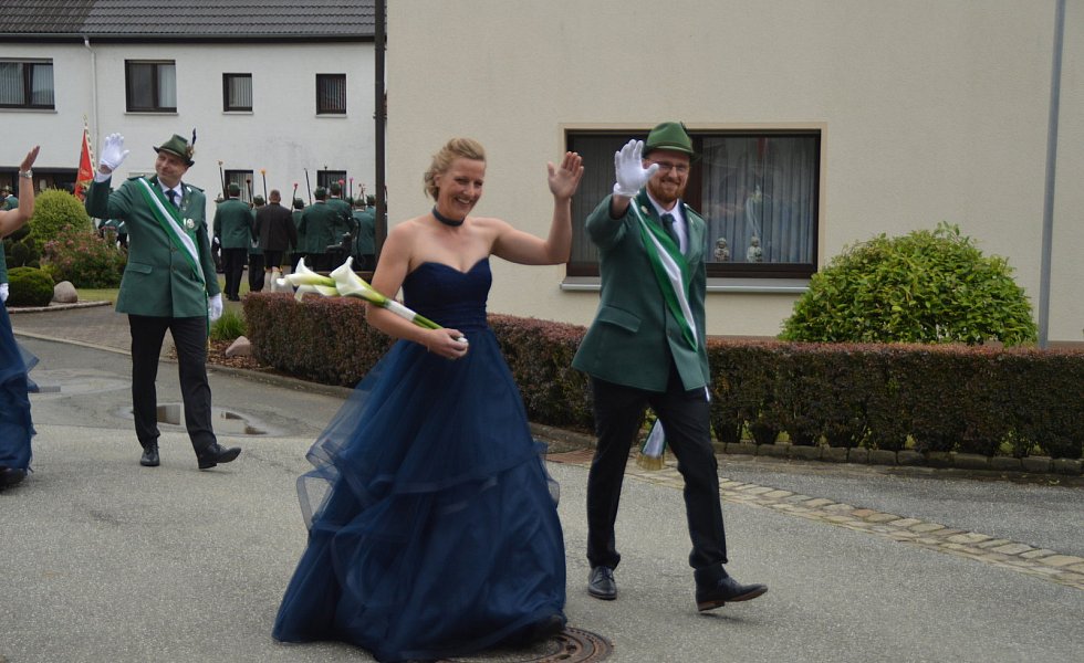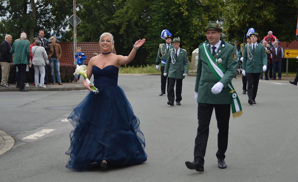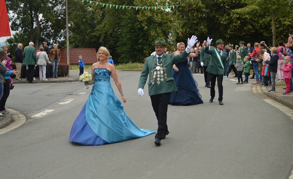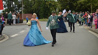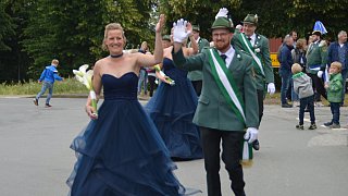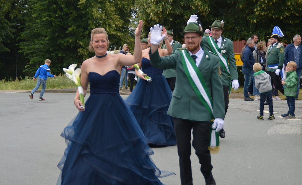 Fröhliche Regenten: Das Königspaar Stefan und Petra Köhne grüßen ihre Bremerberger Freunde und Gäste während der Festparade
