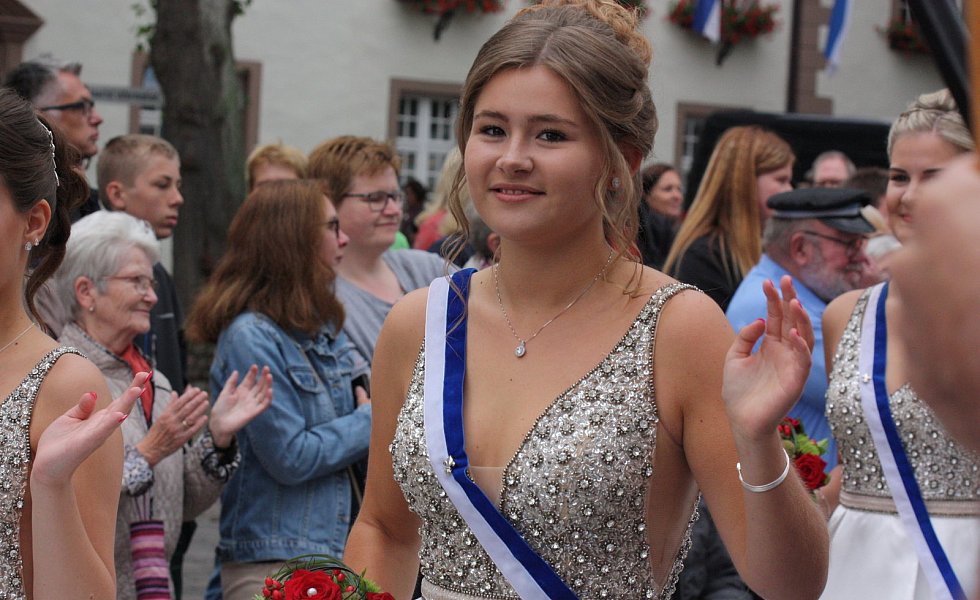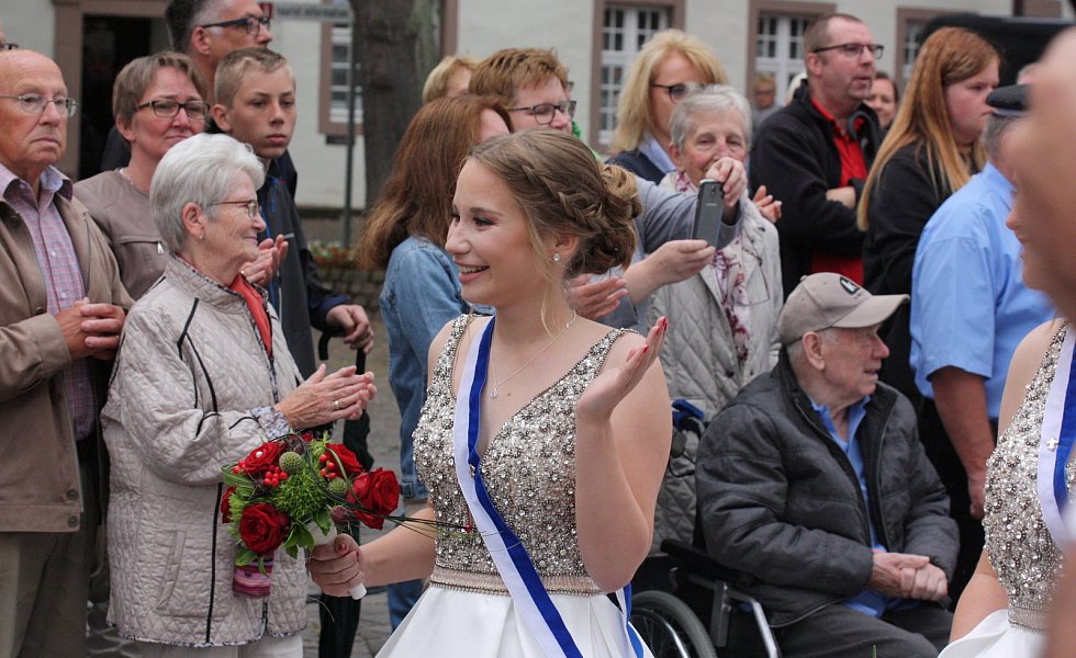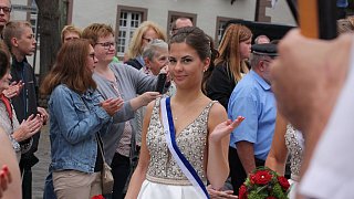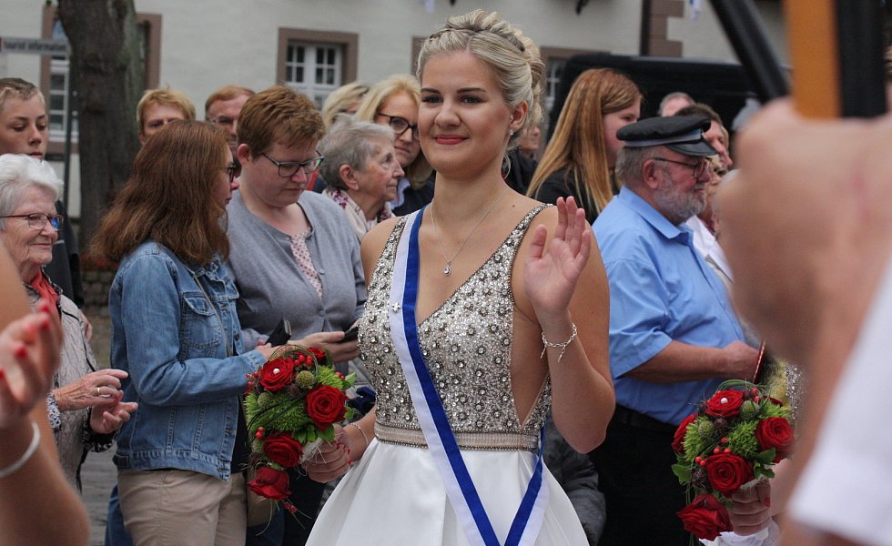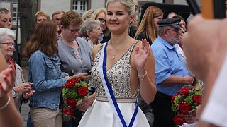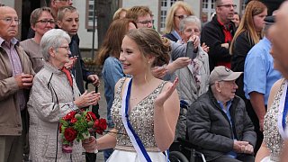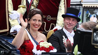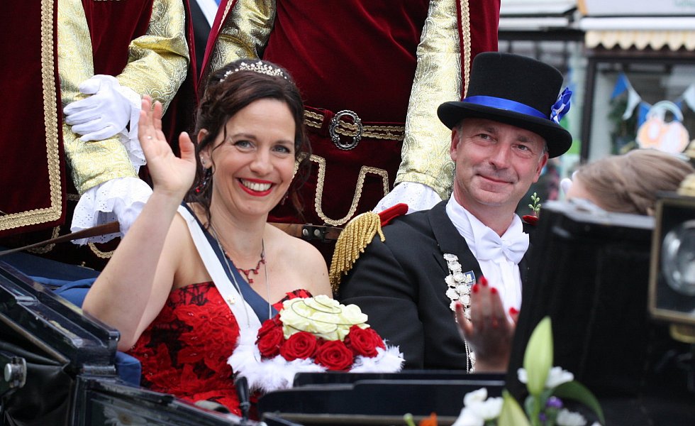 Strahlendes Lächeln: Schützenkönig Markus Billeb und Schützenkönigin Sarah Marx fahren durch die Stadt.