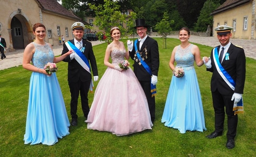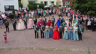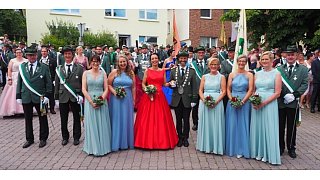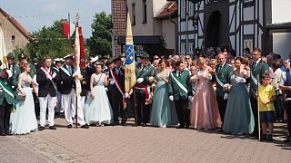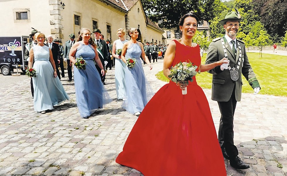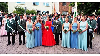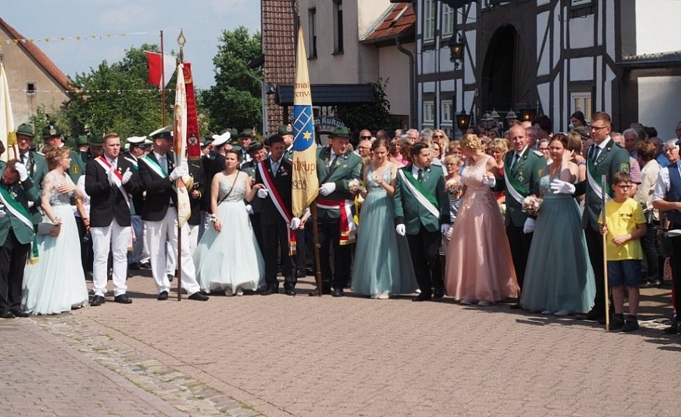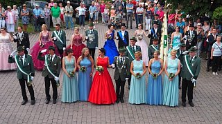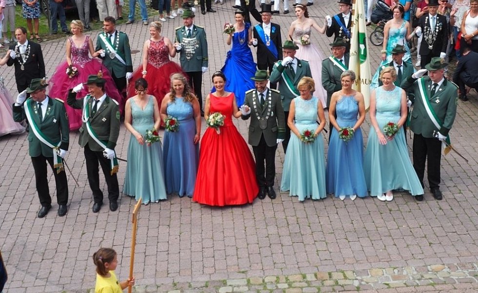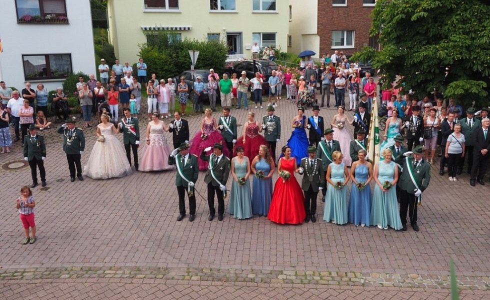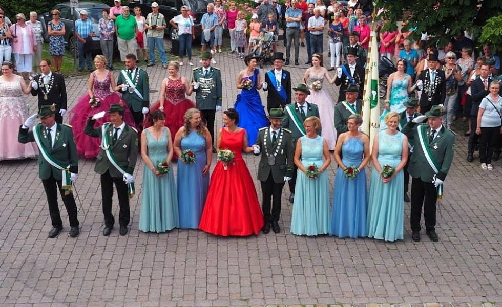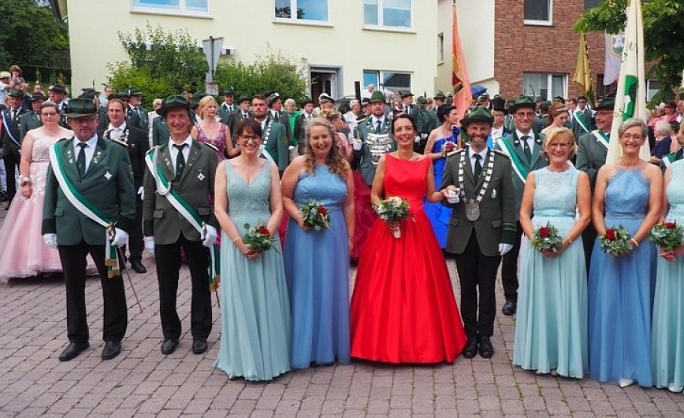 Umringt von den Königspaaren der Nieheimer Ortschaften präsentierte sich der Thron des Gastgebers mit Konrad Rolf (v. l.), Peter Süper, Lydia Rolf-Becker, Ulrike Kleine, dem Königspaar Renate und Martin Gerling, Hildegard Lohr, Steffi Rolf sowie Heike und Stephan Papenkordt.