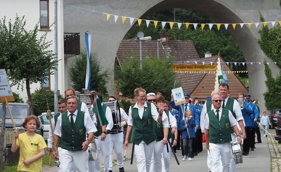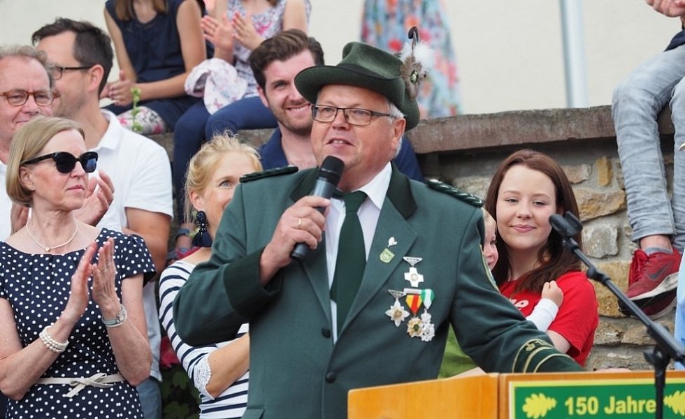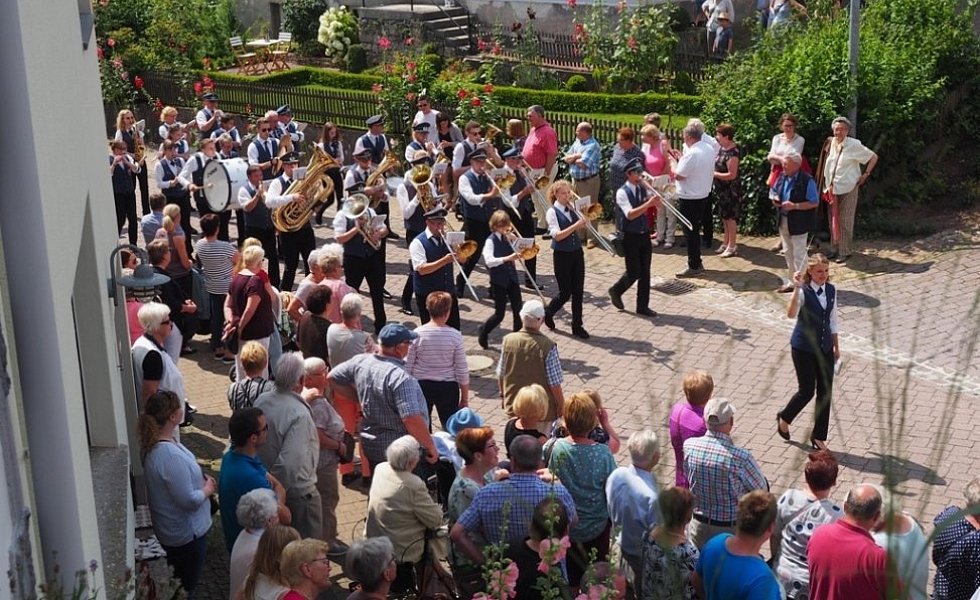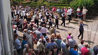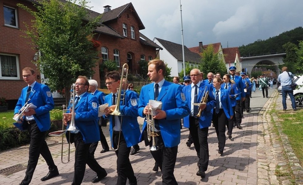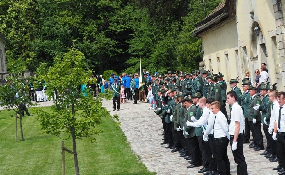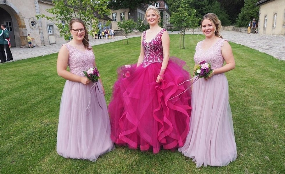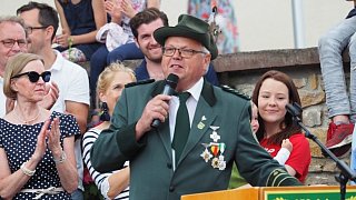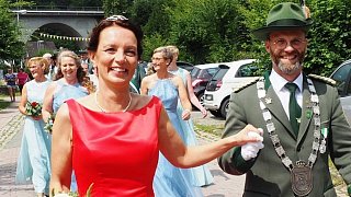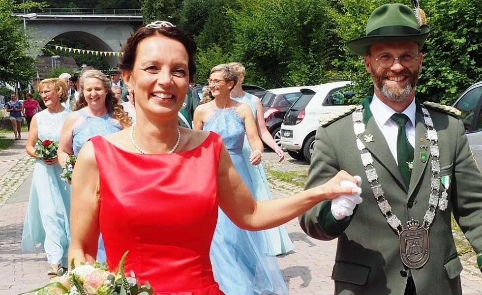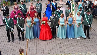 Umringt von den Königspaaren der Nieheimer Ortschaften präsentierte sich der Thron des Gastgebers mit Konrad Rolf (v. l.), Peter Süper, Lydia Rolf-Becker, Ulrike Kleine, dem Königspaar Renate und Martin Gerling, Hildegard Lohr, Steffi Rolf sowie Heike und Stephan Papenkordt.
