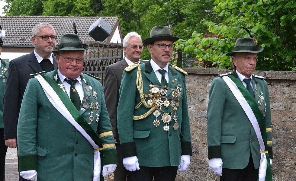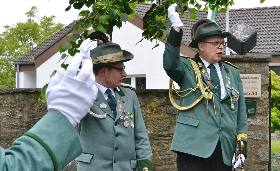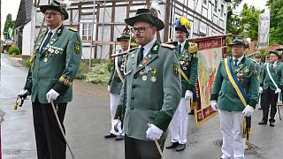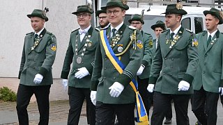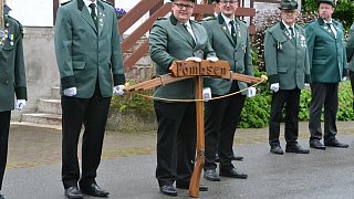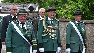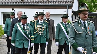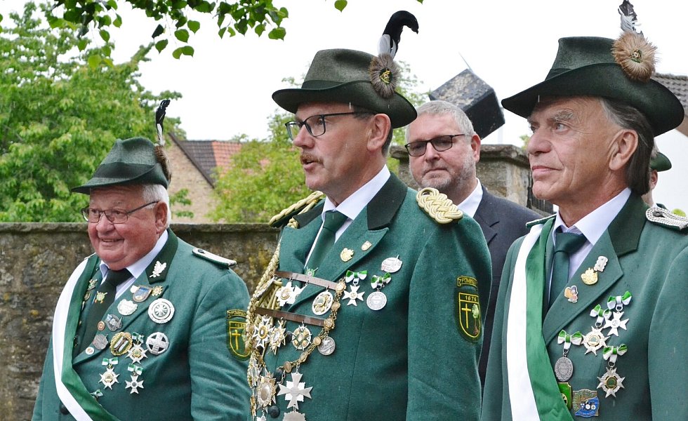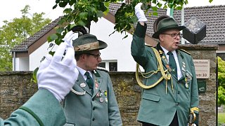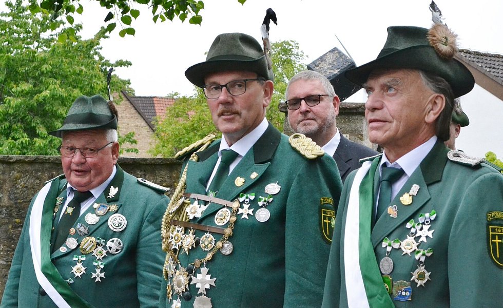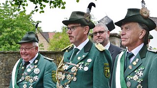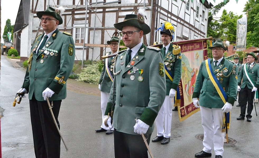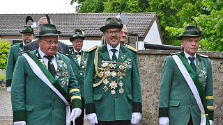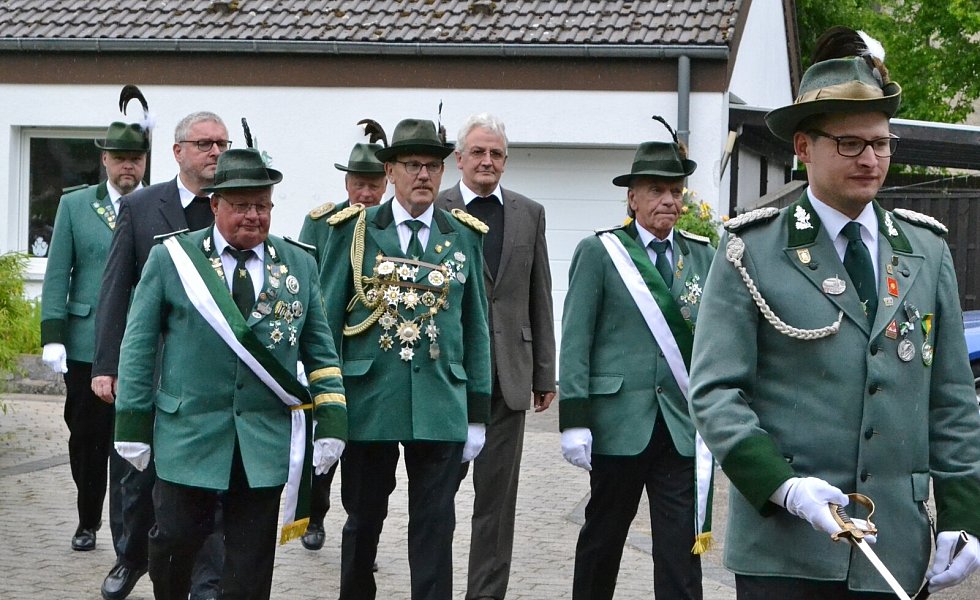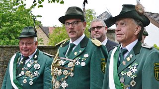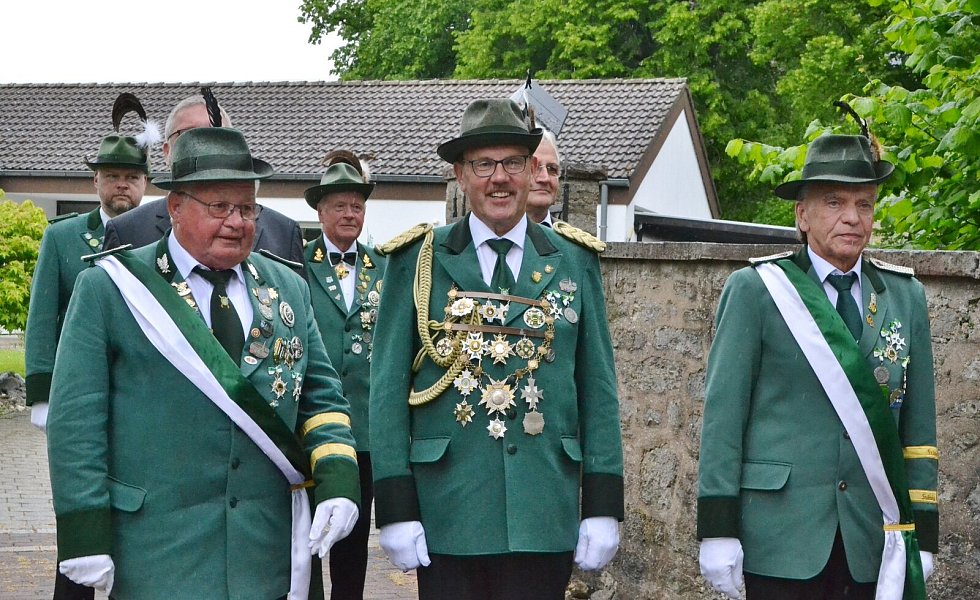 König Wilfried Rüthers und seine Offiziere Franz Versen und Michael Fischer mussten in diesem Jahr krankheitsbedingt leider auf die Damen an ihrer Seite verzichten. Die Schützen im Bergdorf ließen ihre Majestät am Sonntag dennoch hochleben.