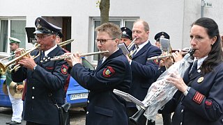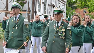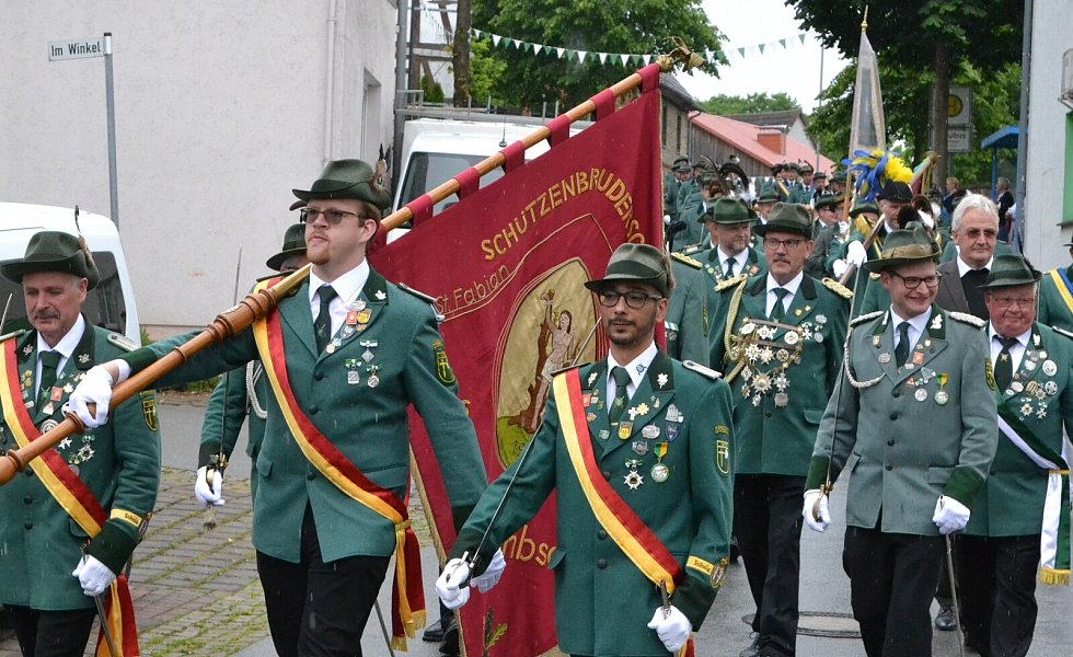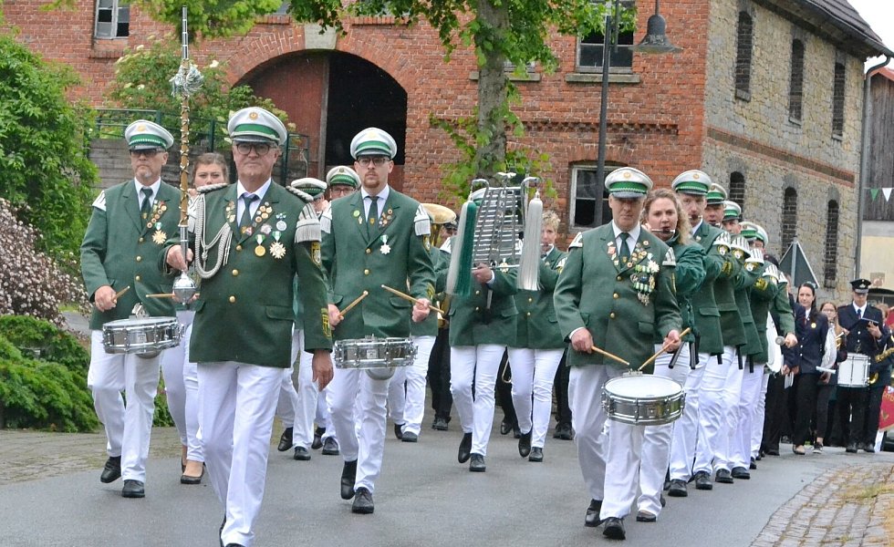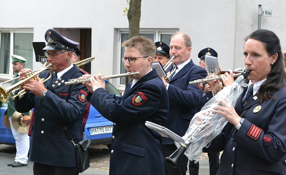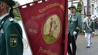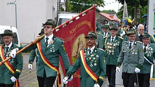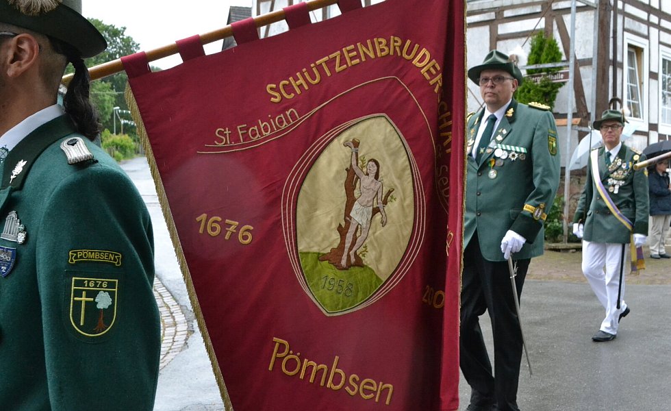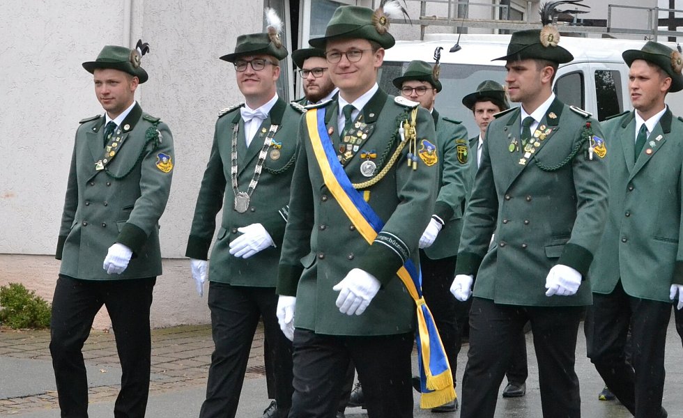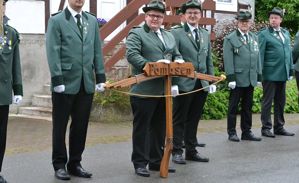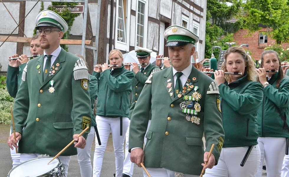 König Wilfried Rüthers und seine Offiziere Franz Versen und Michael Fischer mussten in diesem Jahr krankheitsbedingt leider auf die Damen an ihrer Seite verzichten. Die Schützen im Bergdorf ließen ihre Majestät am Sonntag dennoch hochleben.