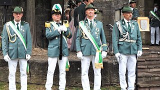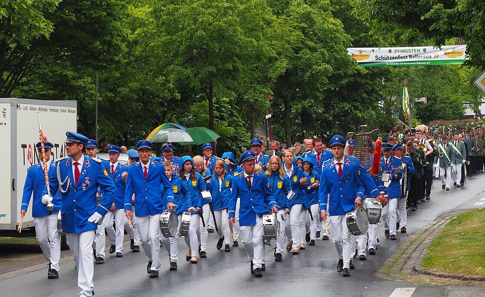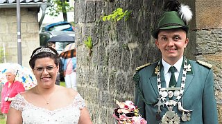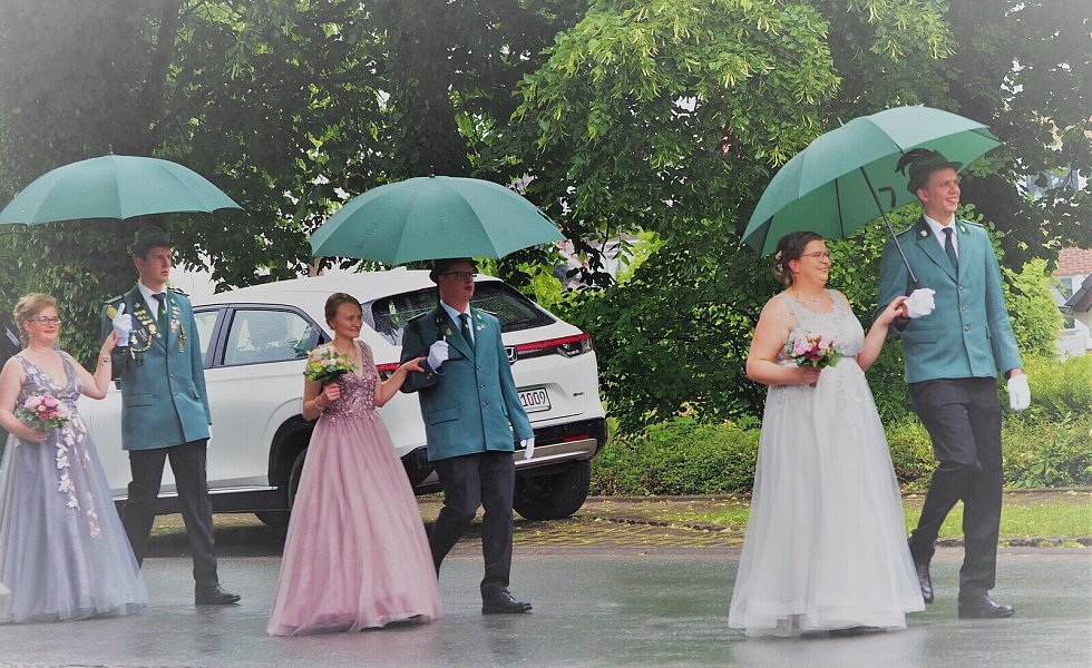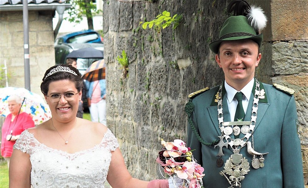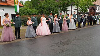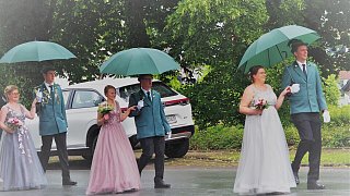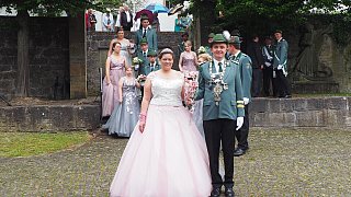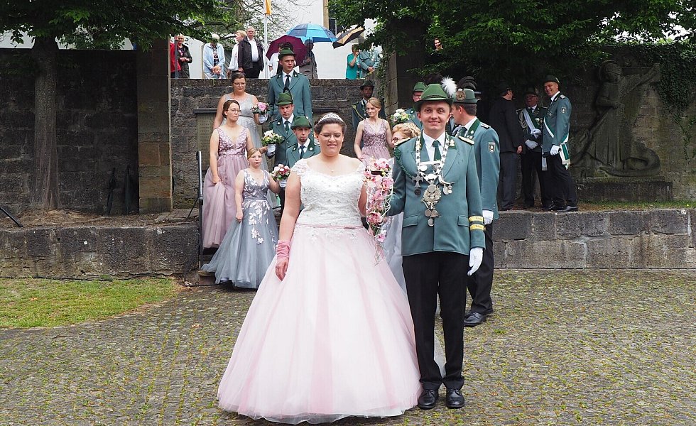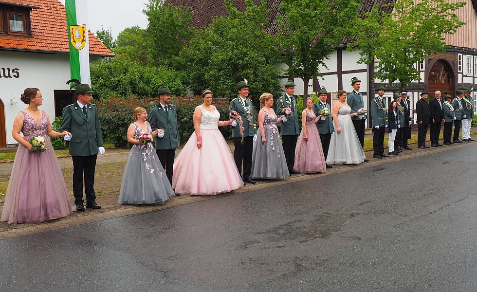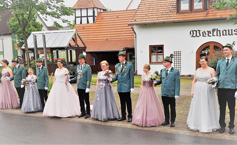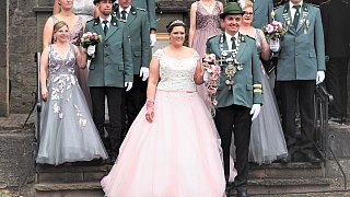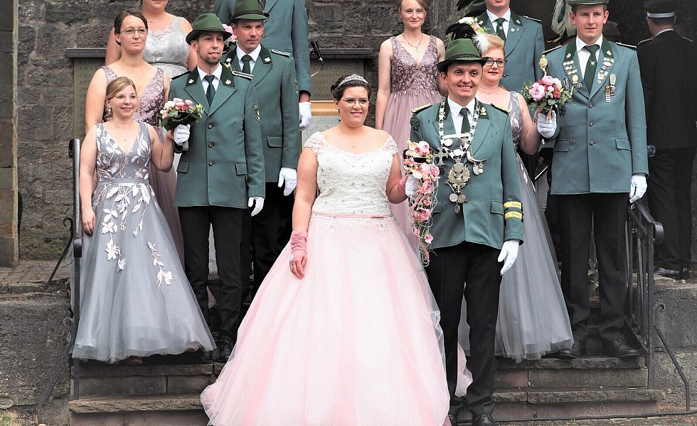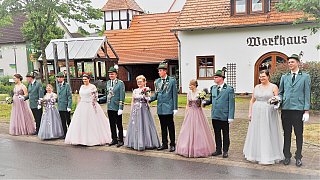 Das Königspaar Markus und Johanna Frewer (vorn, Mitte), umrahmt von seinem Hofstaat beim Schützenfest in Bellersen.