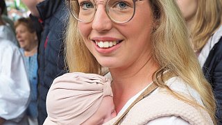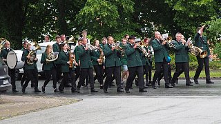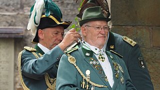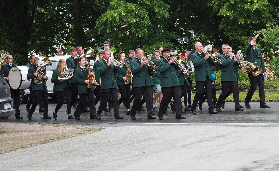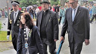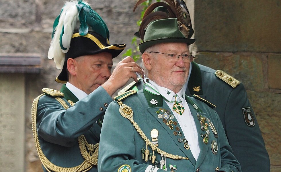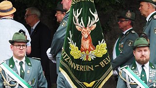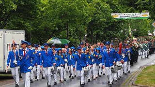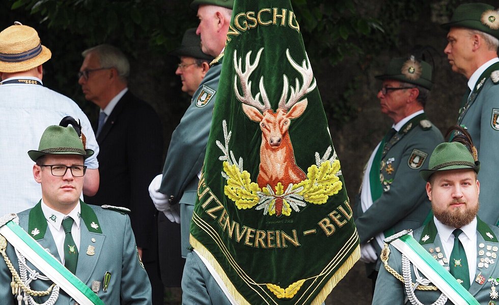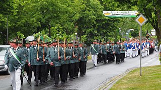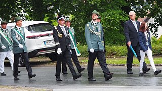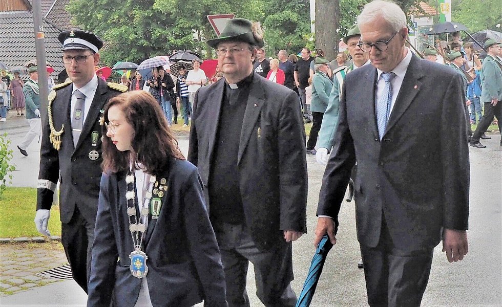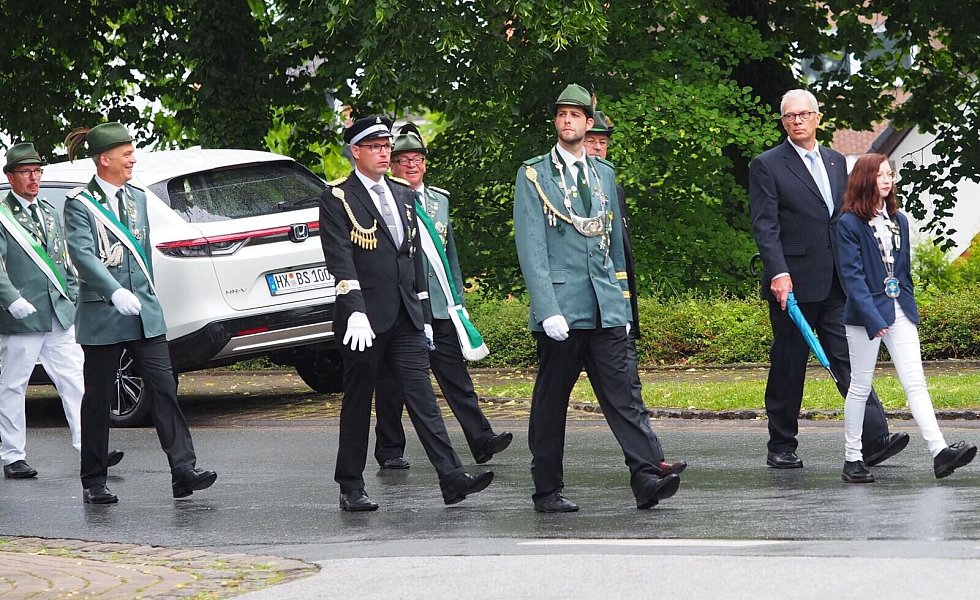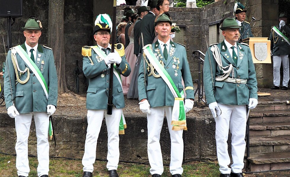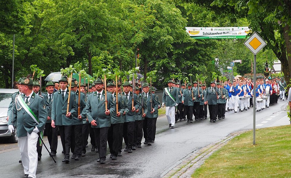 Das Königspaar Markus und Johanna Frewer (vorn, Mitte), umrahmt von seinem Hofstaat beim Schützenfest in Bellersen.
