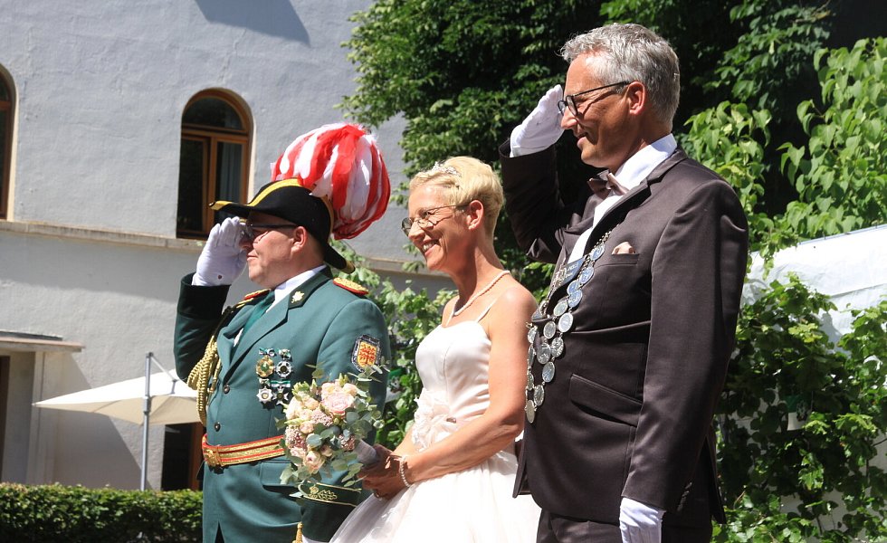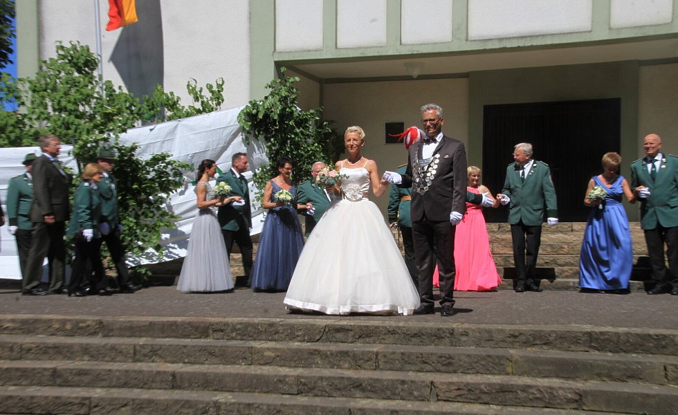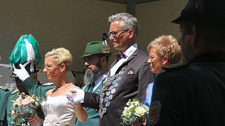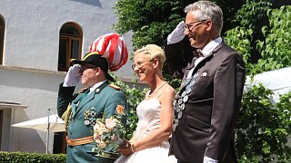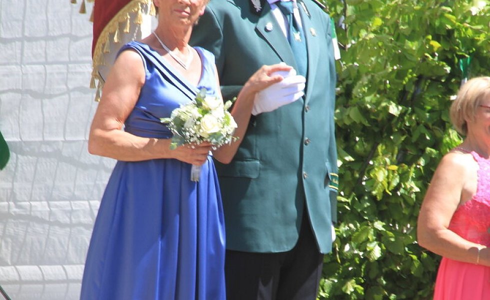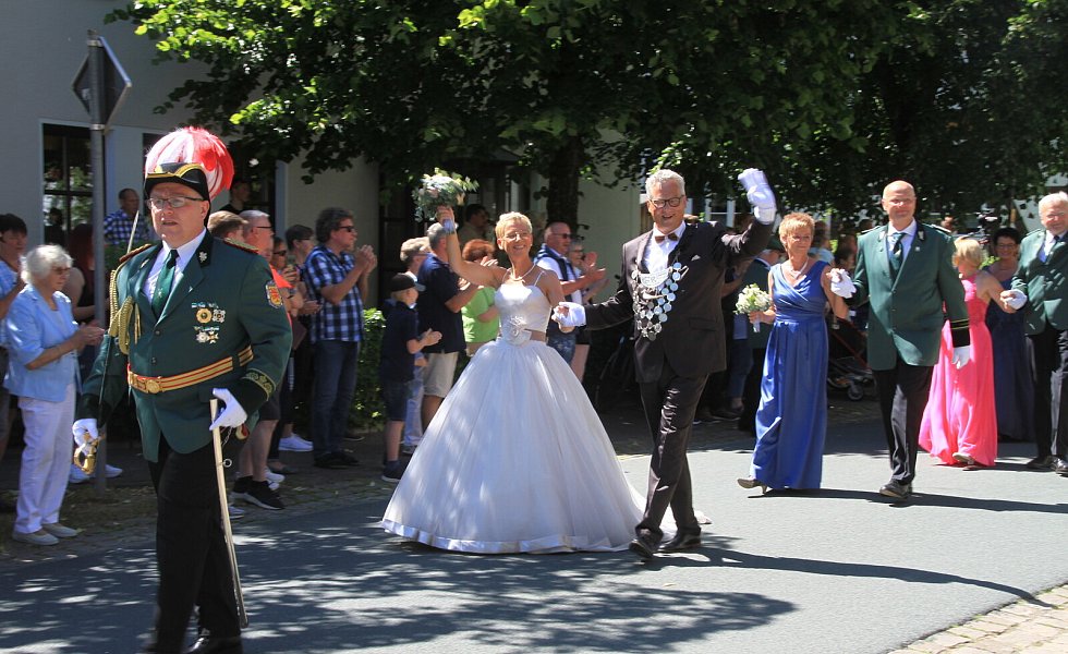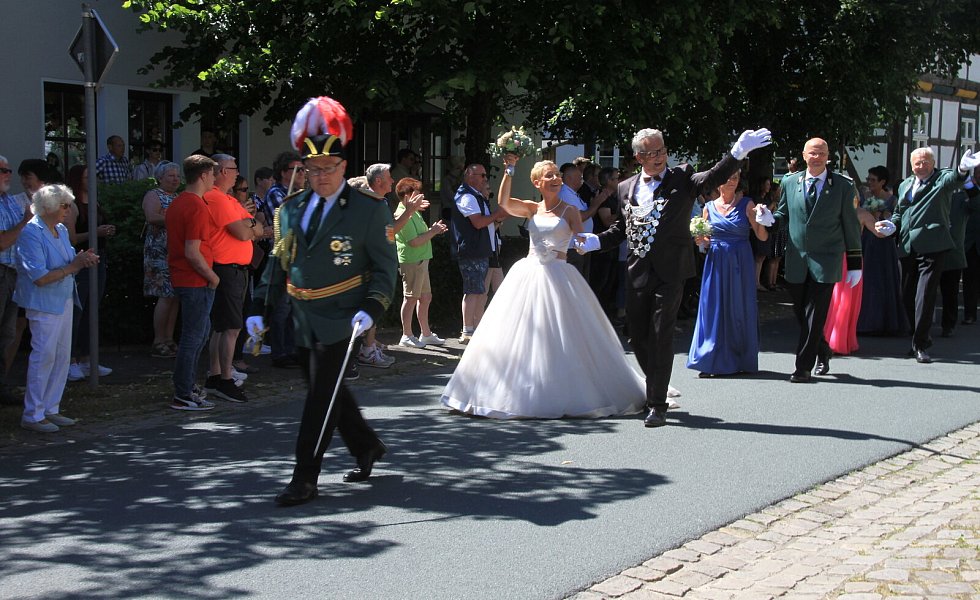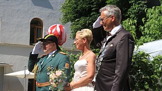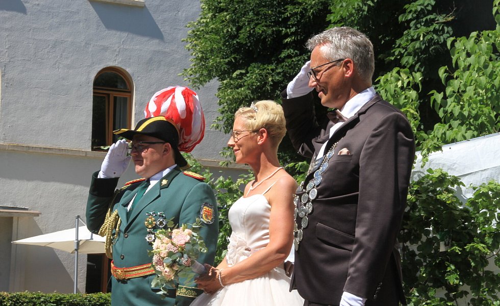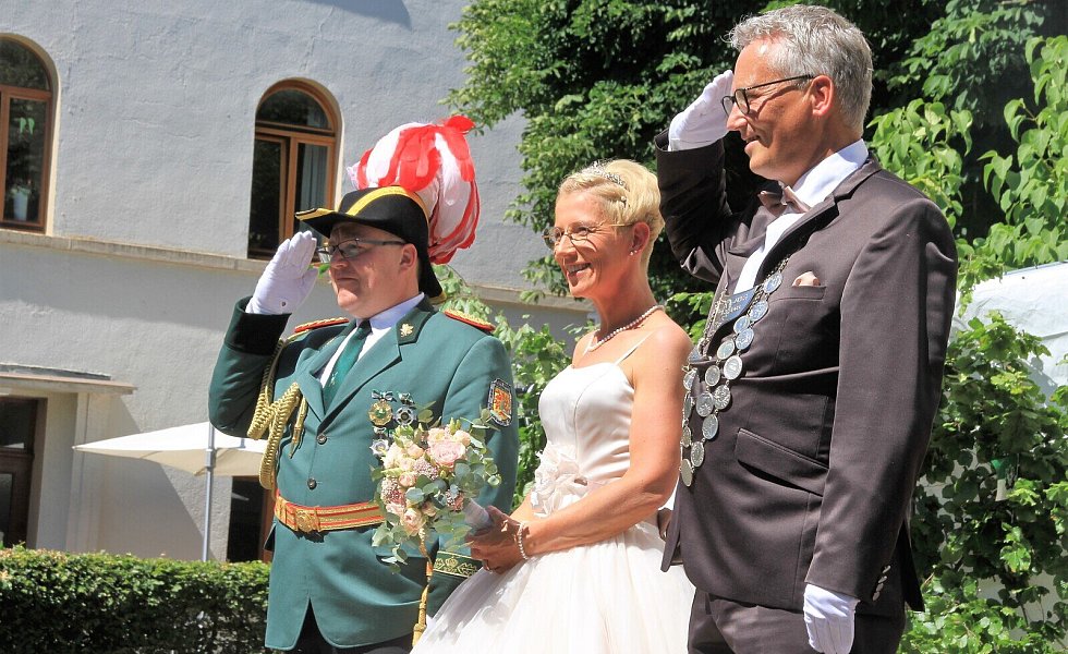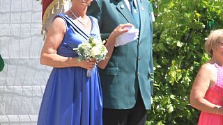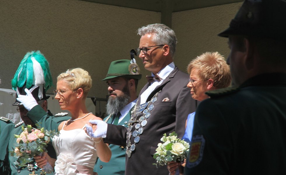 Gerhard Broer und Nadine Holzhauer-Broer versprühen gute Laune beim Parademarsch der Bökendorfer Schützen vor der Pfarrkirche.
