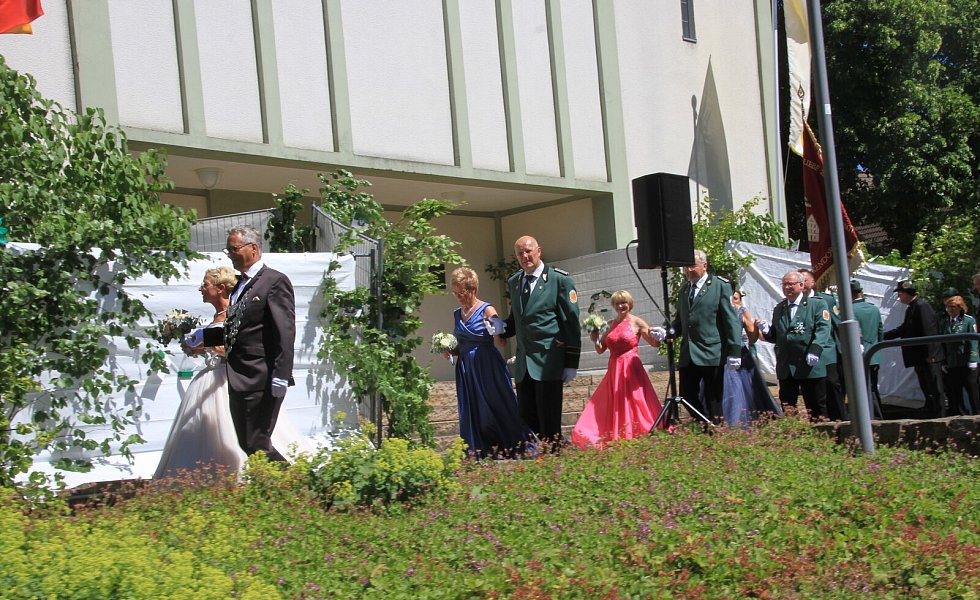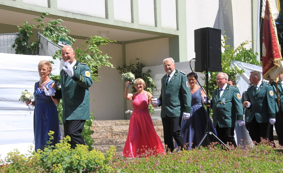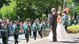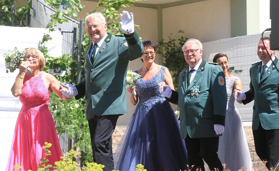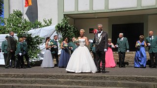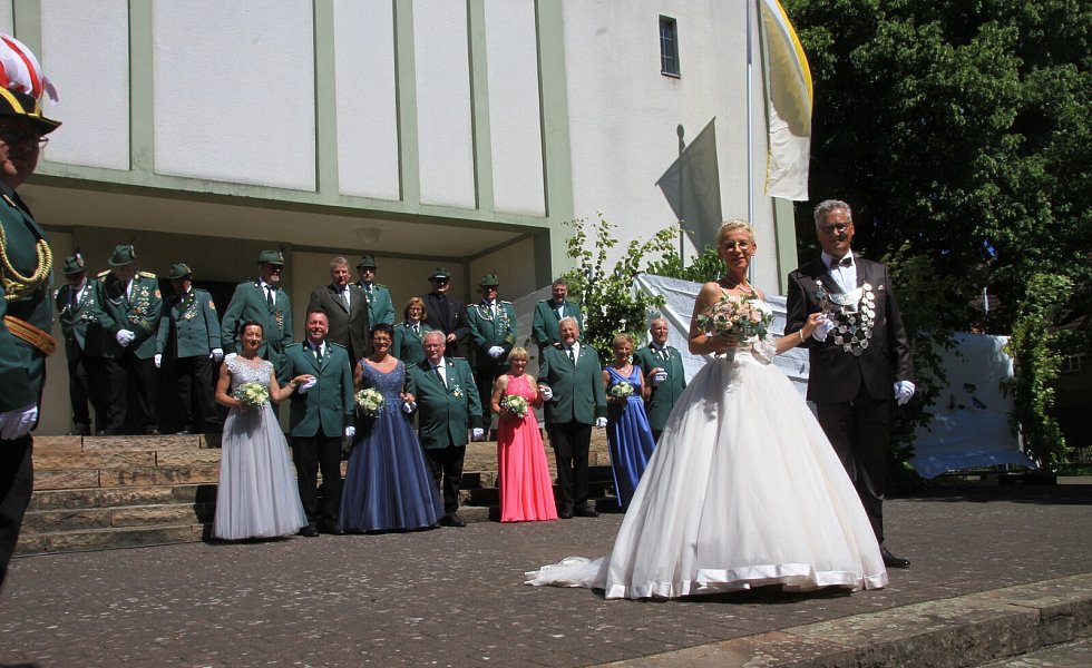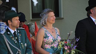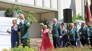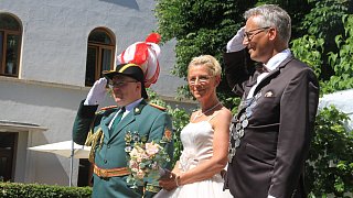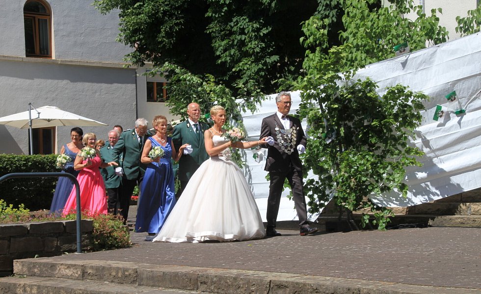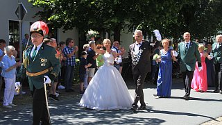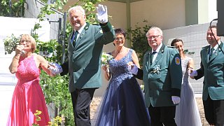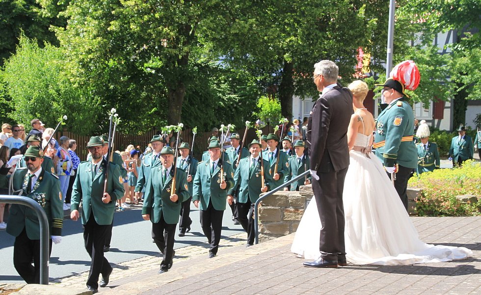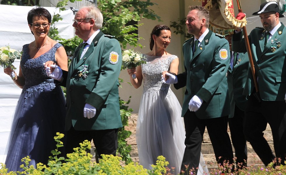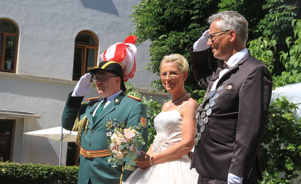 Gerhard Broer und Nadine Holzhauer-Broer versprühen gute Laune beim Parademarsch der Bökendorfer Schützen vor der Pfarrkirche.