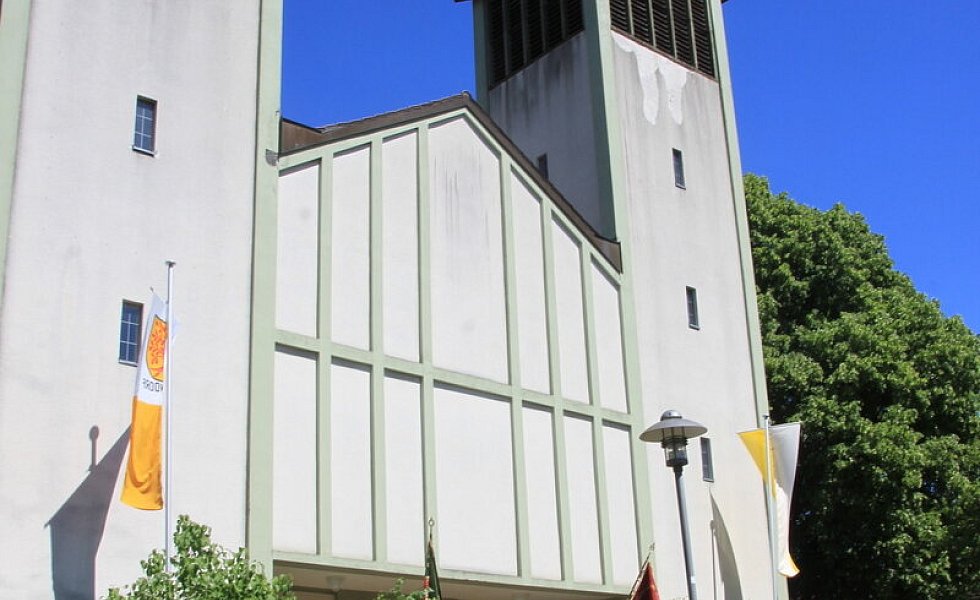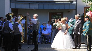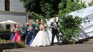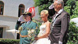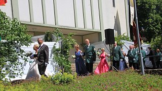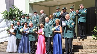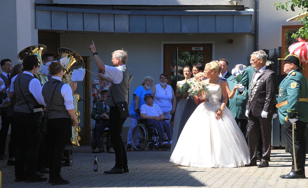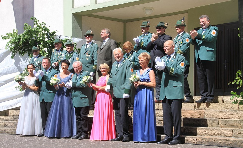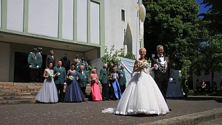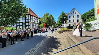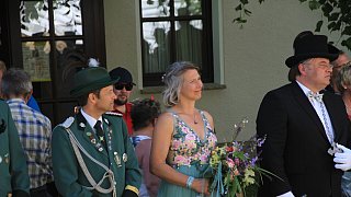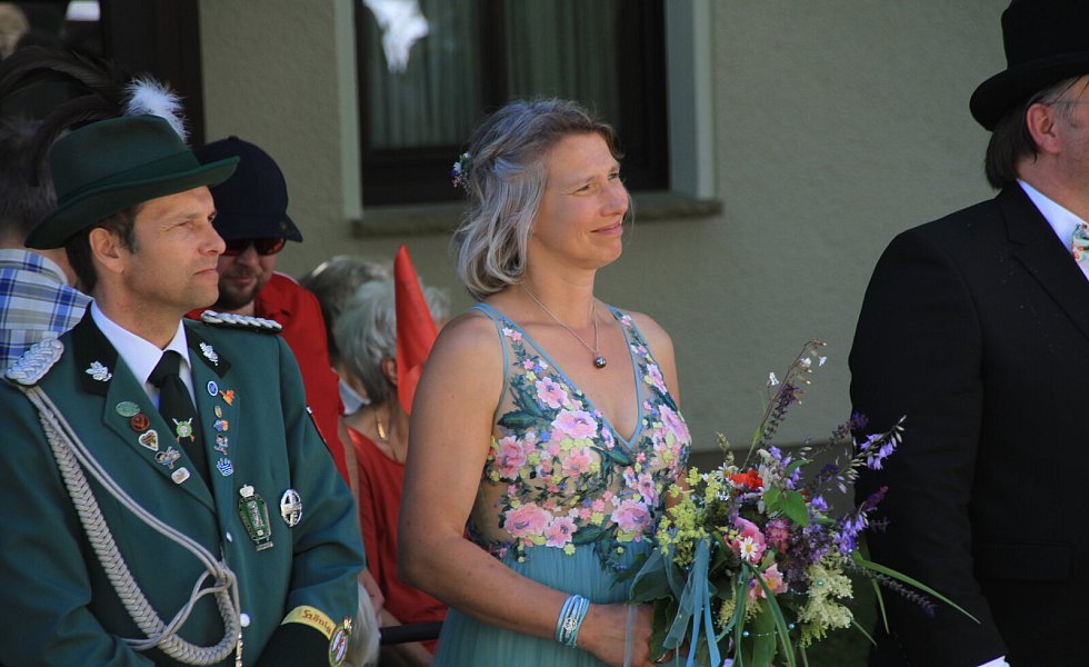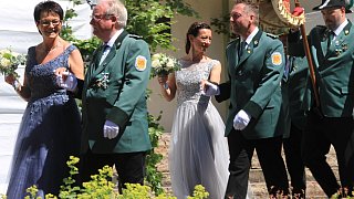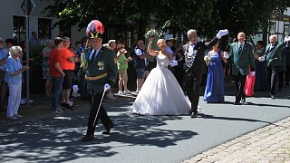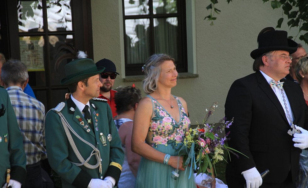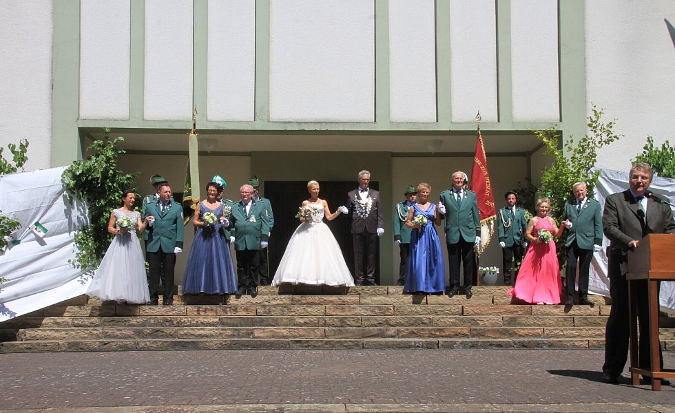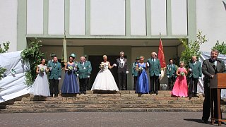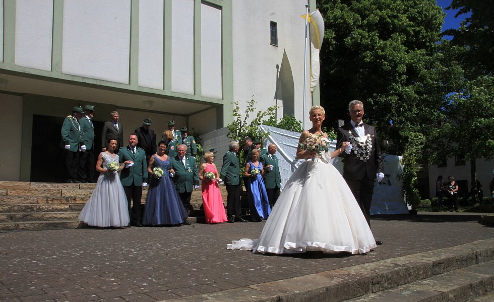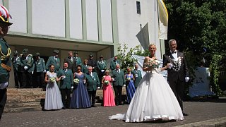 Gerhard Broer und Nadine Holzhauer-Broer versprühen gute Laune beim Parademarsch der Bökendorfer Schützen vor der Pfarrkirche.