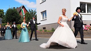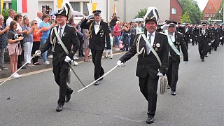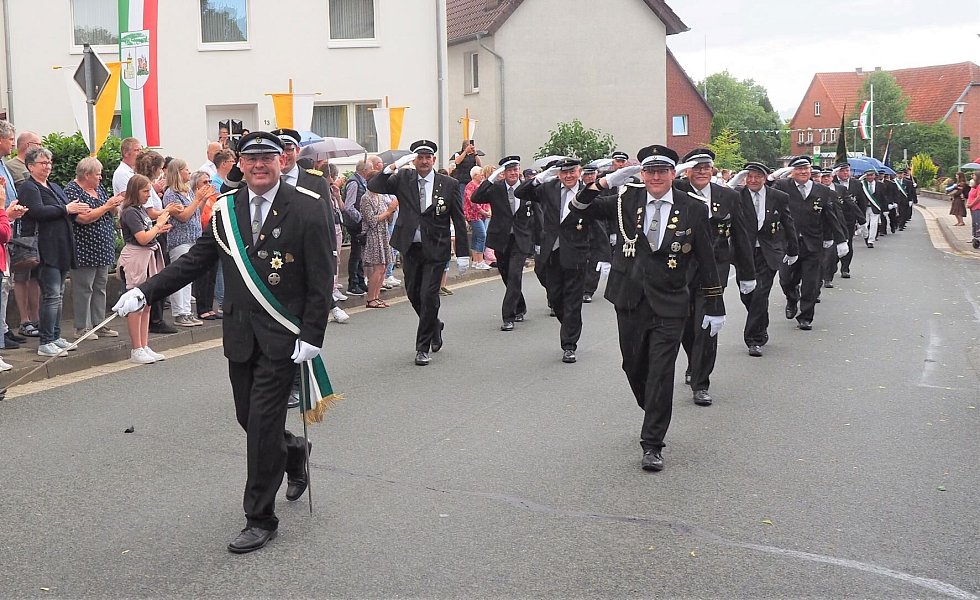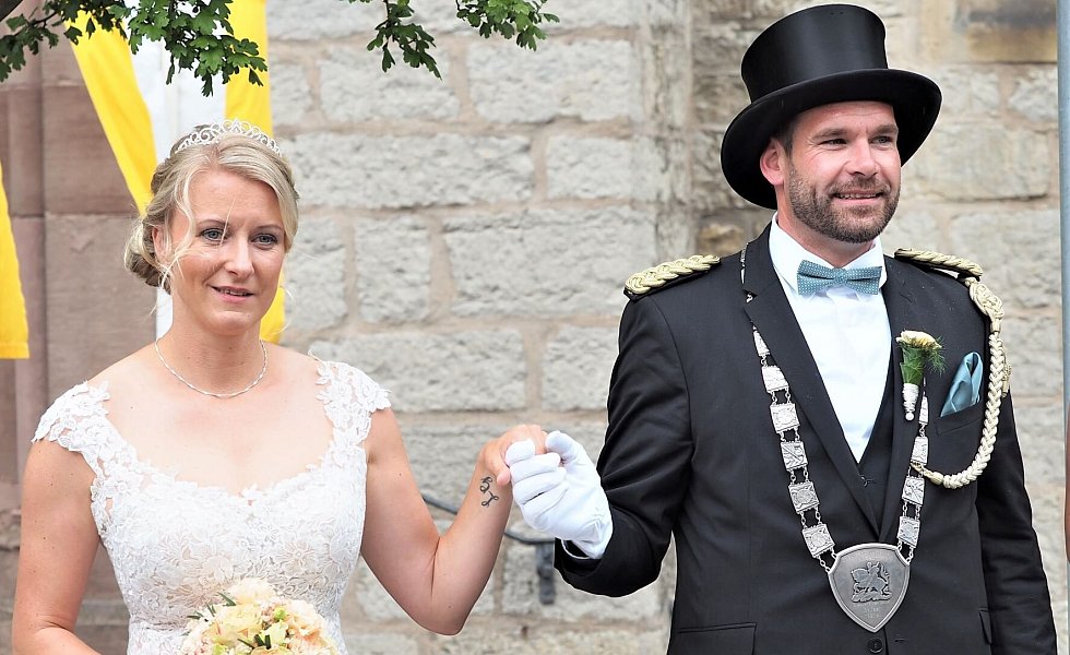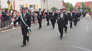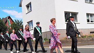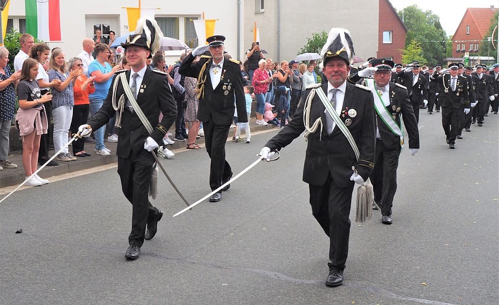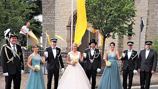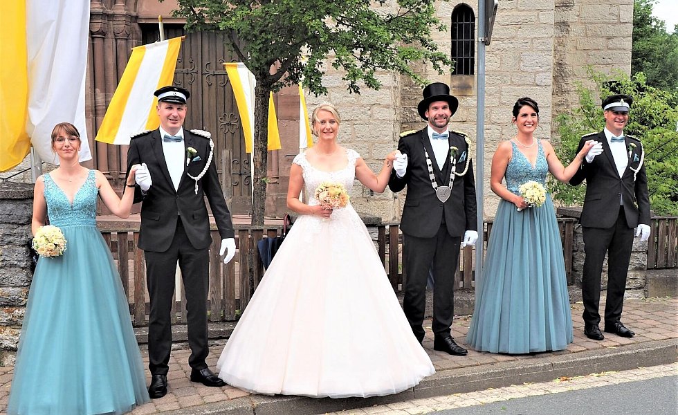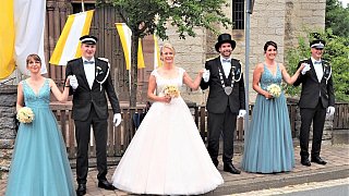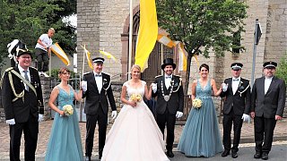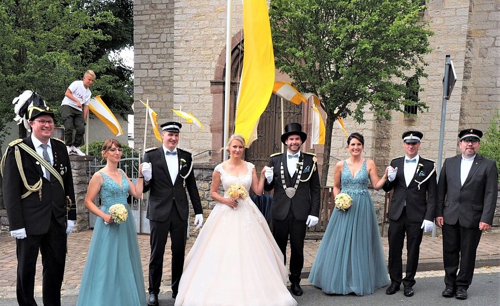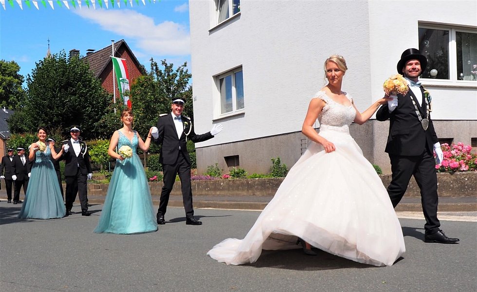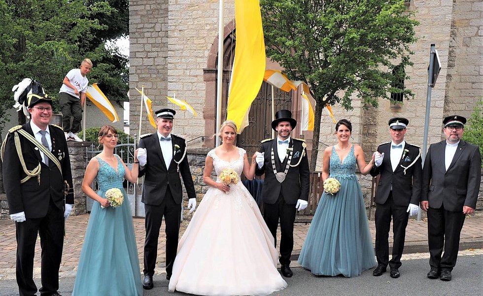 Oberst Sebastian Helmes (v. l.), Anna-Lena und Matthias Helmes, Königin Charlene Drewes, König Thomas Ostermann, Corinna und Jens Kunstein sowie Präses Markus Jux.