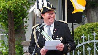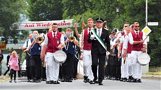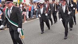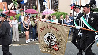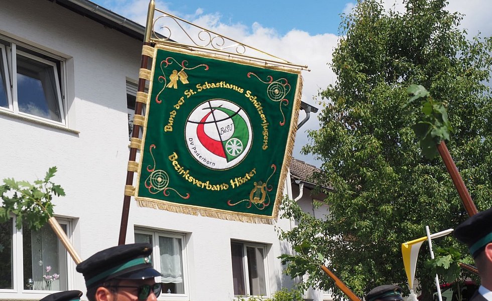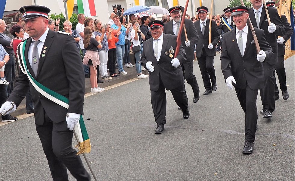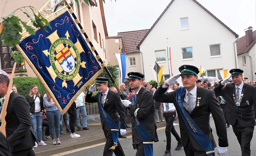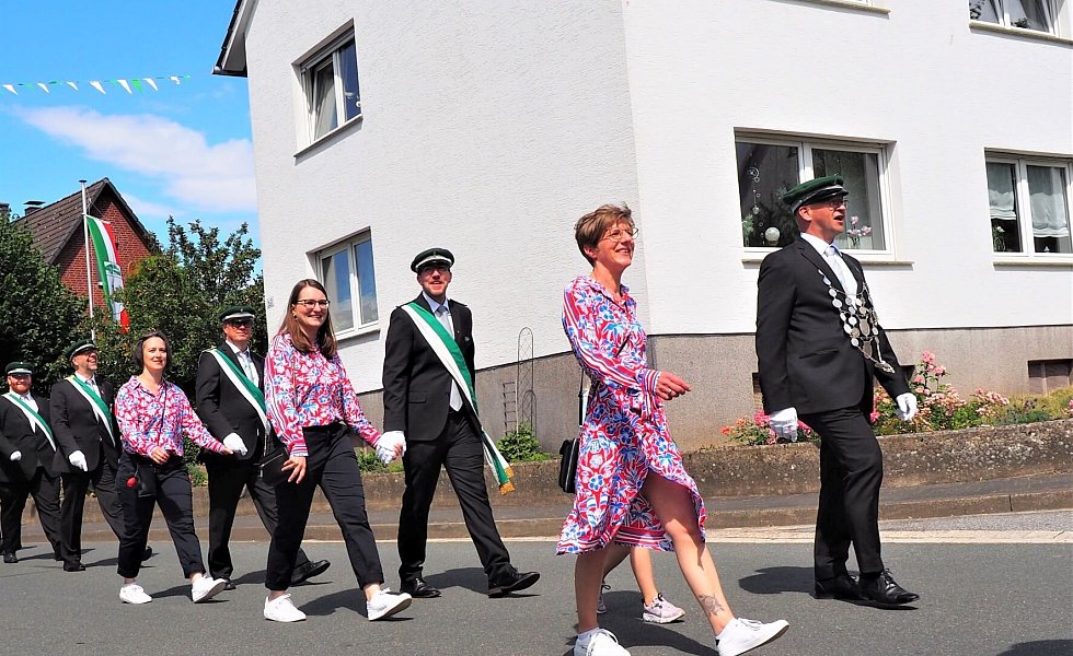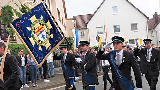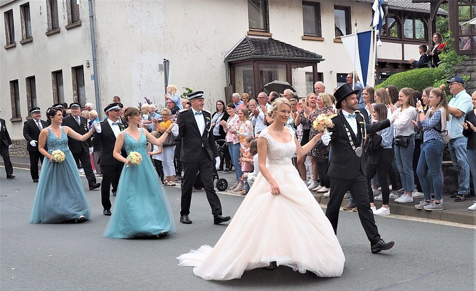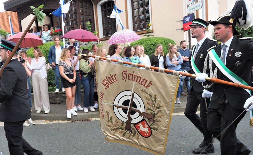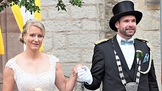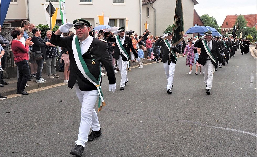Oberst Sebastian Helmes (v. l.), Anna-Lena und Matthias Helmes, Königin Charlene Drewes, König Thomas Ostermann, Corinna und Jens Kunstein sowie Präses Markus Jux.