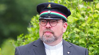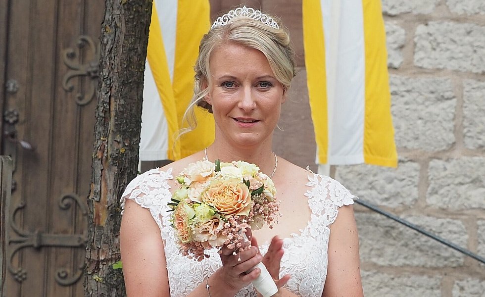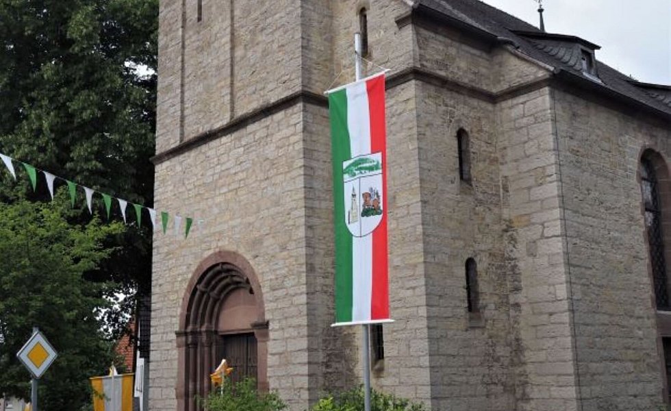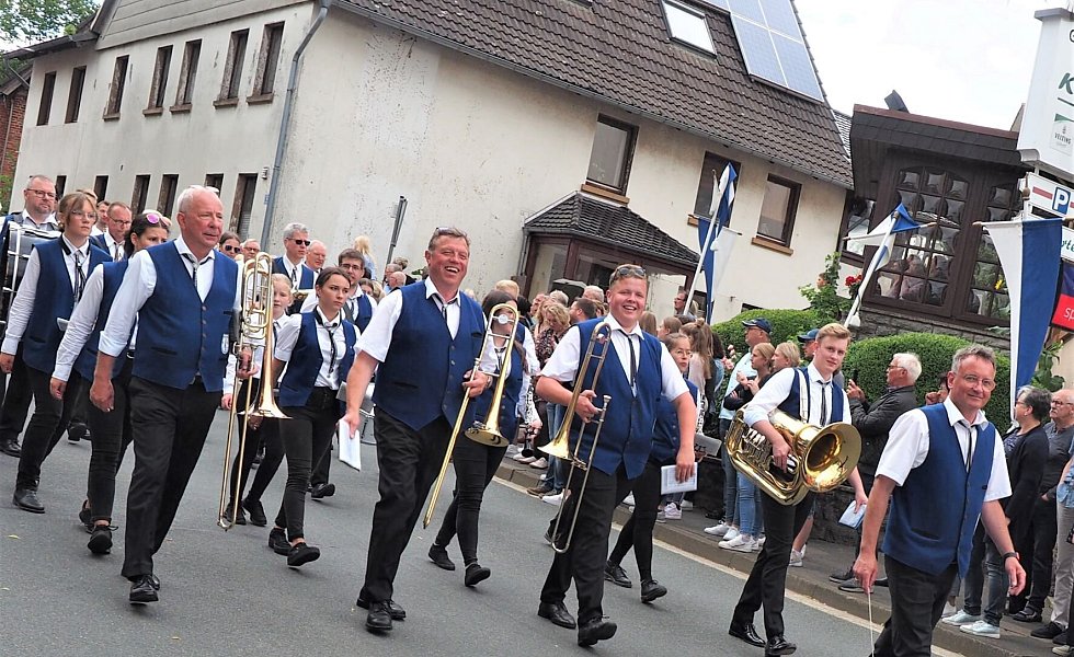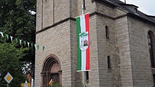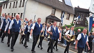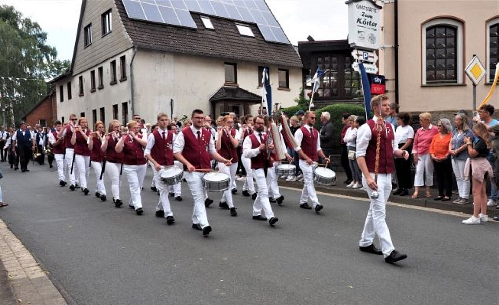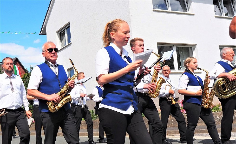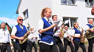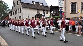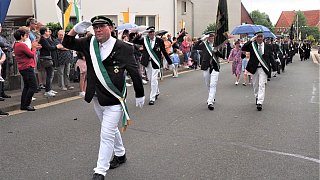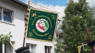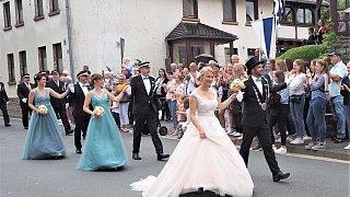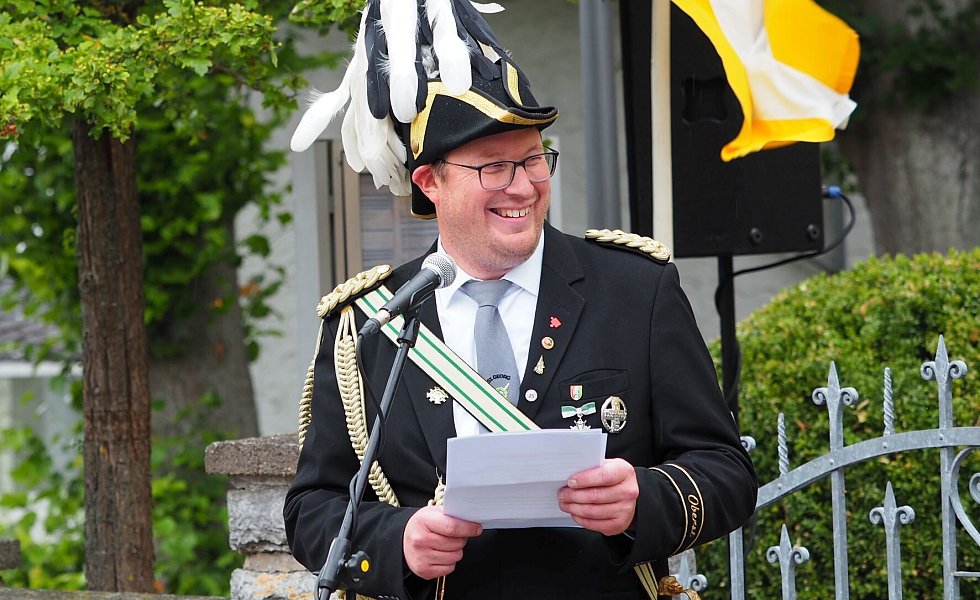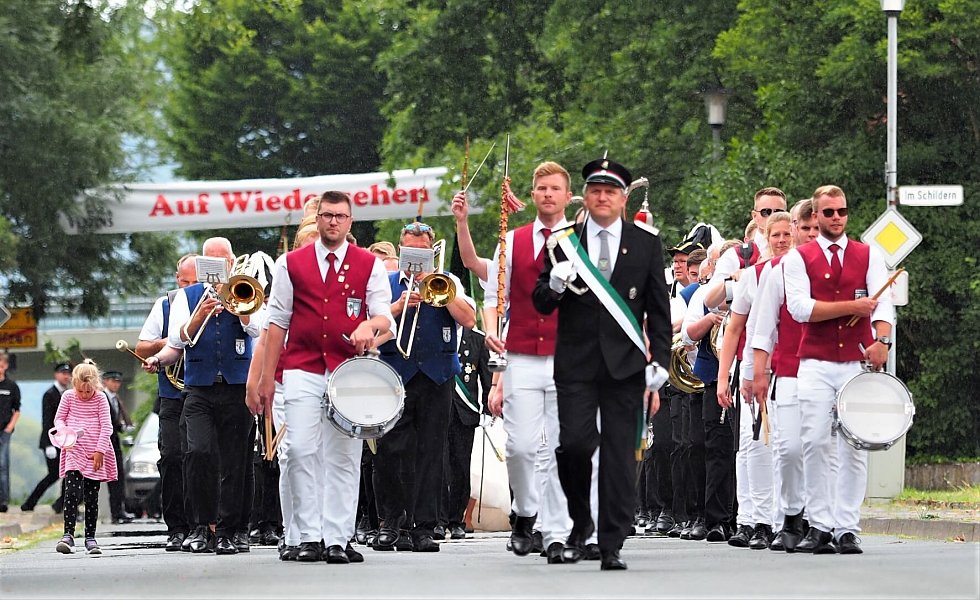Oberst Sebastian Helmes (v. l.), Anna-Lena und Matthias Helmes, Königin Charlene Drewes, König Thomas Ostermann, Corinna und Jens Kunstein sowie Präses Markus Jux.
