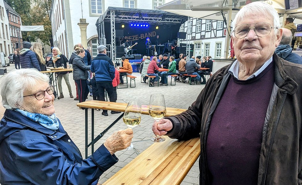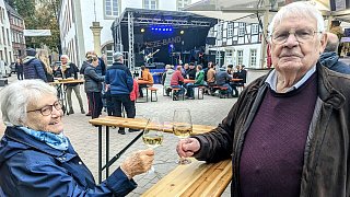 Dieses Seniorenpaar genießt den Michaelismarkt mit einem Gläschen vom Stand des Mosel-Weinguts Hammes.
