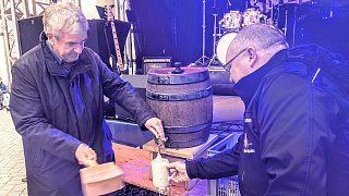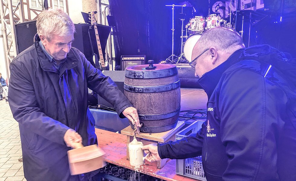 Bürgermeister Hermann Temme sticht im Beisein von Schlossbrauerei-Braumeister Michael Lange das Freibier-Fass an.