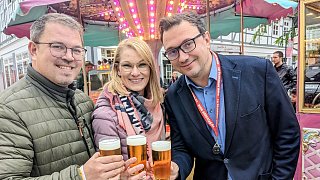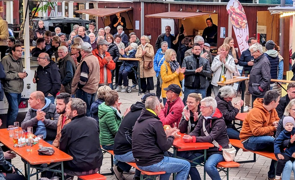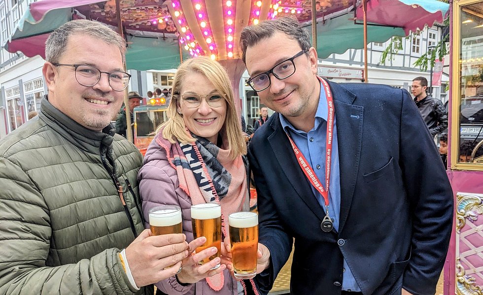 Organisator Andreas Tebbe (r.) vom Brakeler Werbering stößt mit Freunden auf einen gelungenen Michaelismarkt an.