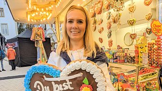 Annika Marx im Kostüm des Brakeler Annekens lädt zum Besuch des Michaelismarkts ein.