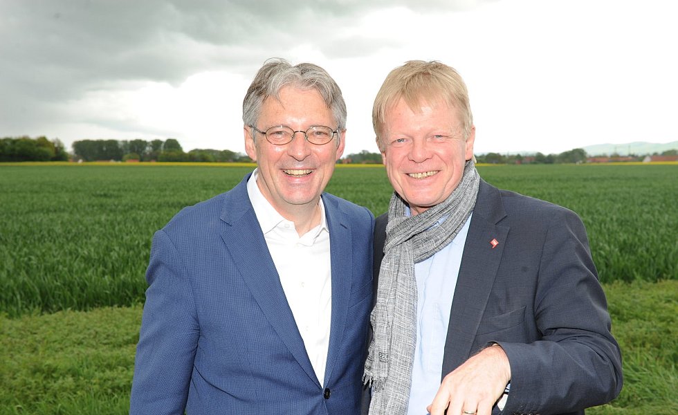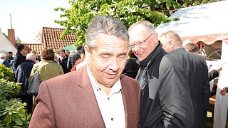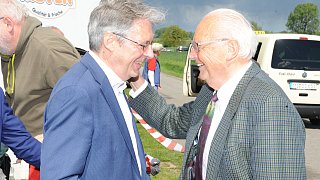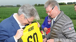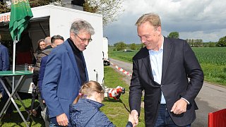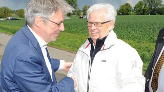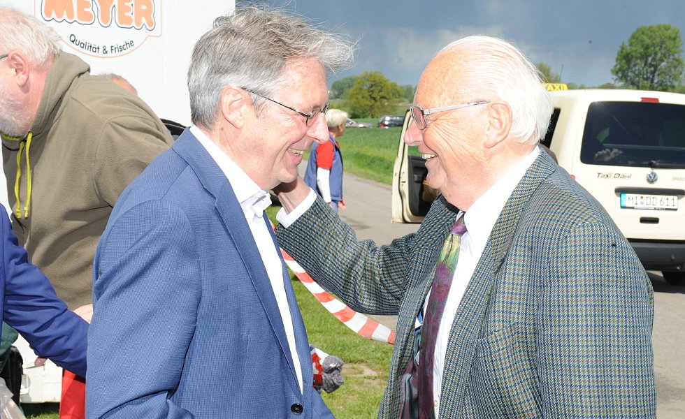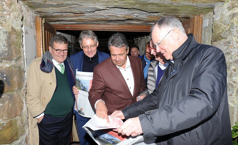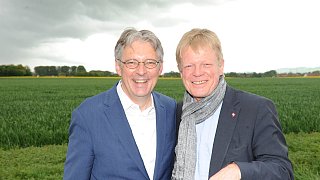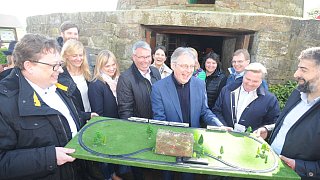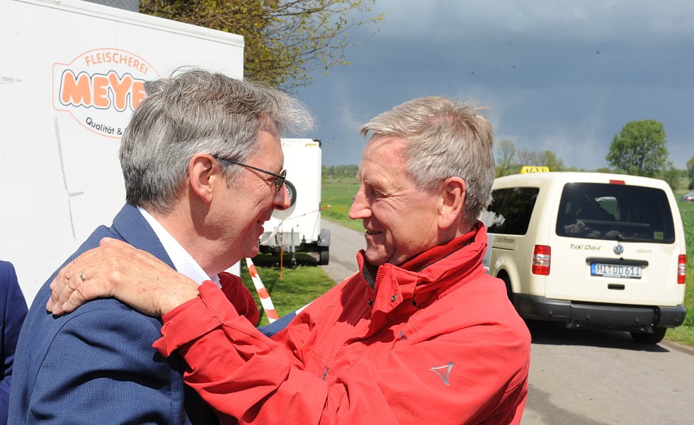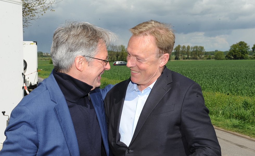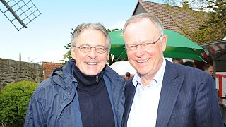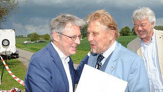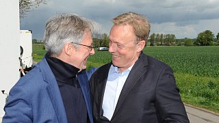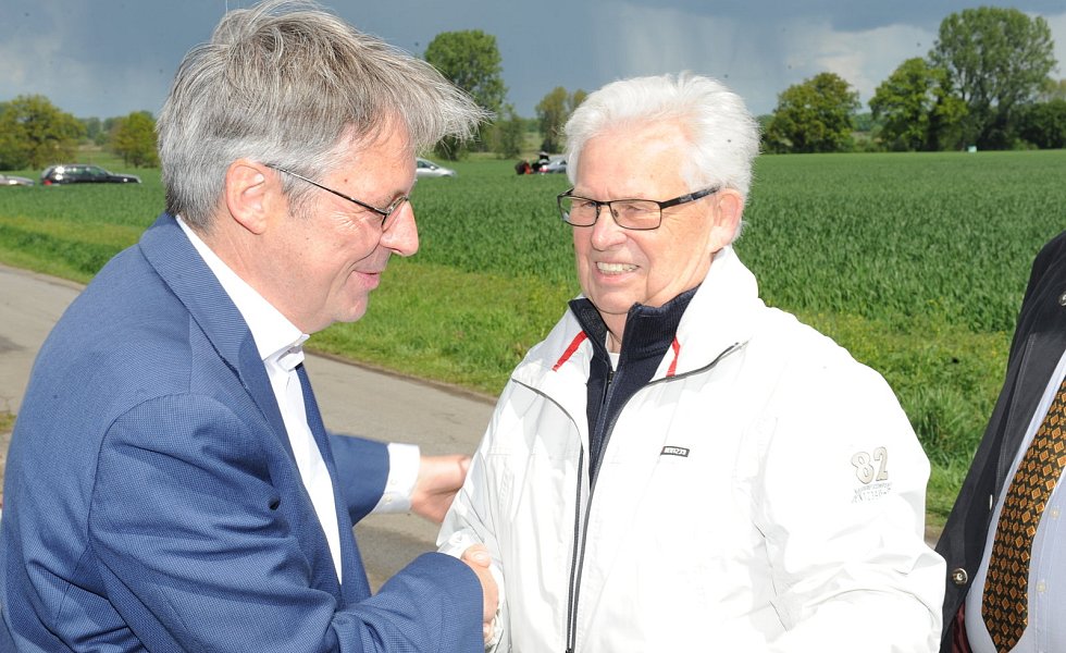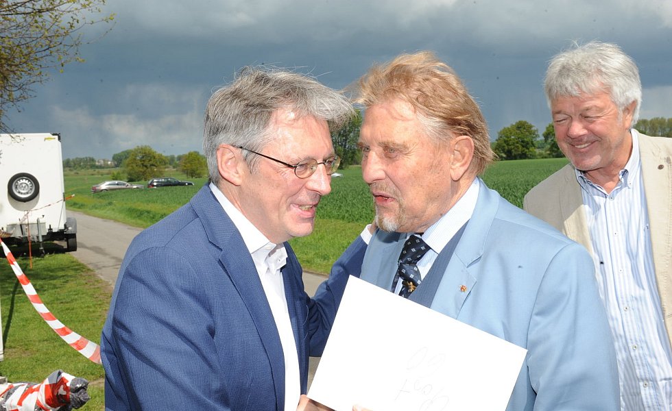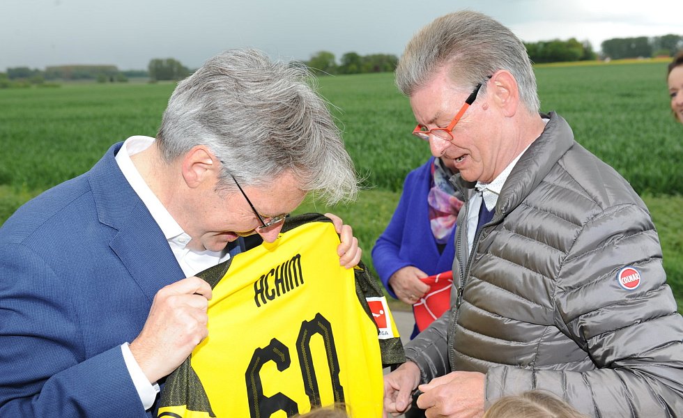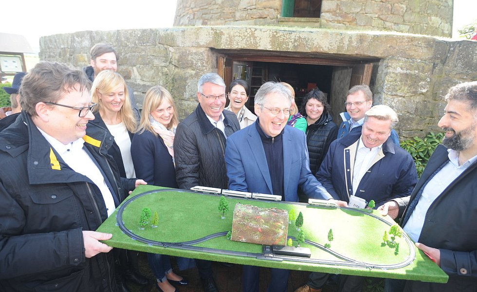 Ausgefallenes Geschenk: In Namen von ostwestfälischen Bundestags- und Landtagsabgeordneten überreichte Stefan Schwartze (l.) Achim Post eine Modellbahn. Gedwimet ist die "Achim, dem Schrecken der Bahnstrecken" und soll ihn an den Kampf gegen die Tunneltrasse durch den Jakobsberg erinnern. Ein Schrecken sei er aber nur für falsche Bahnstrecken, schmunzelte Achim Post.