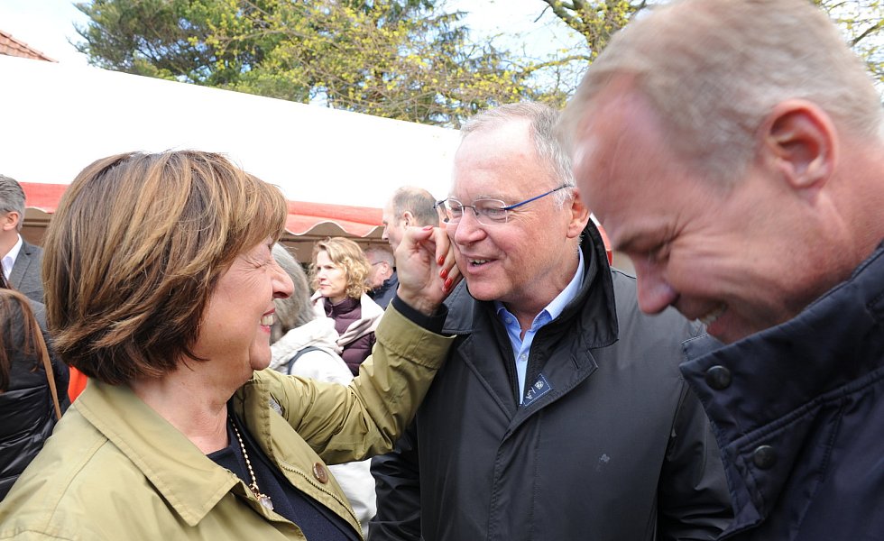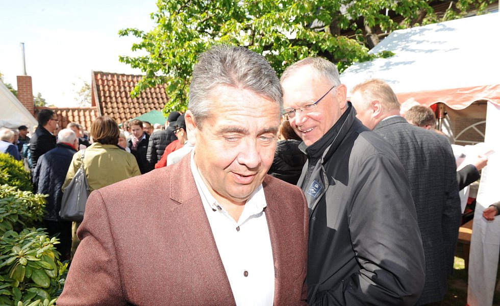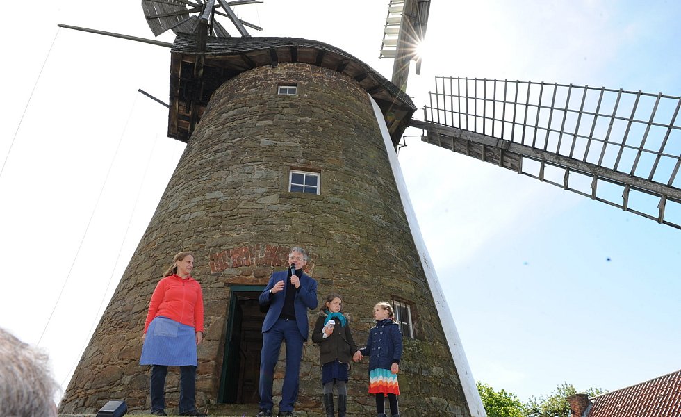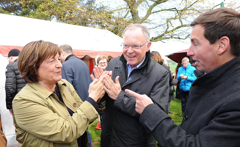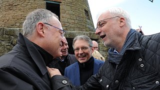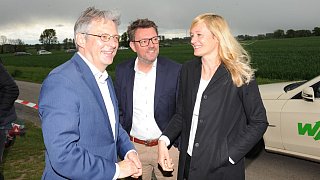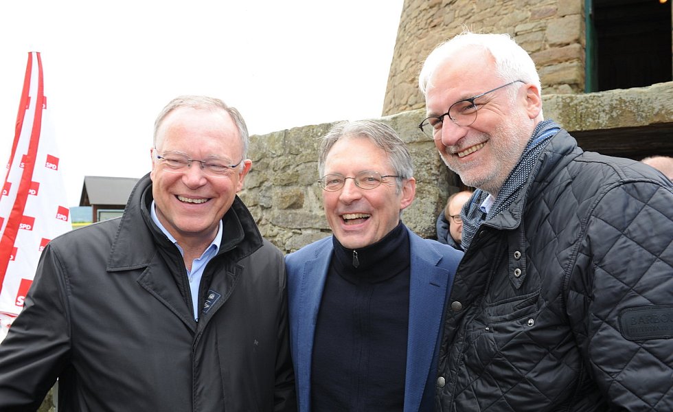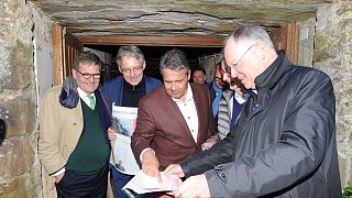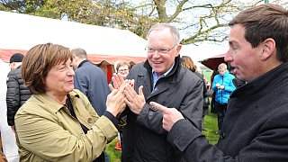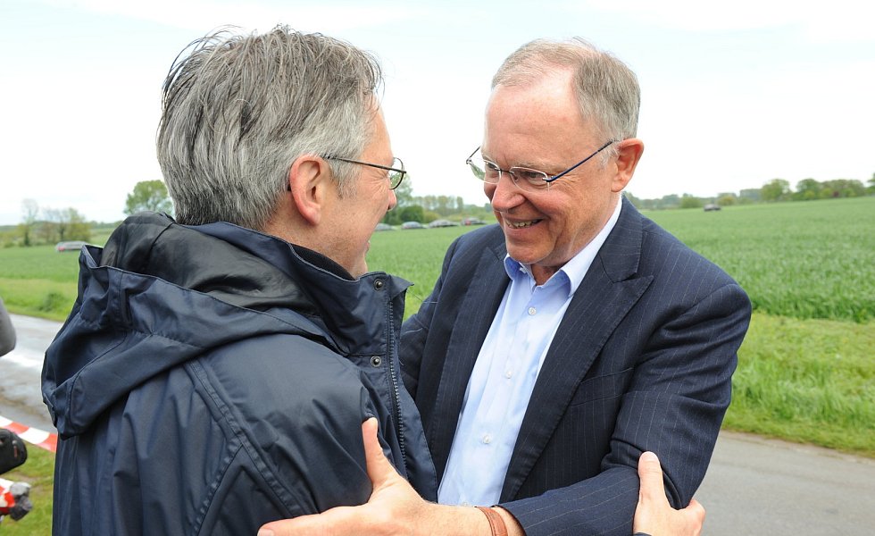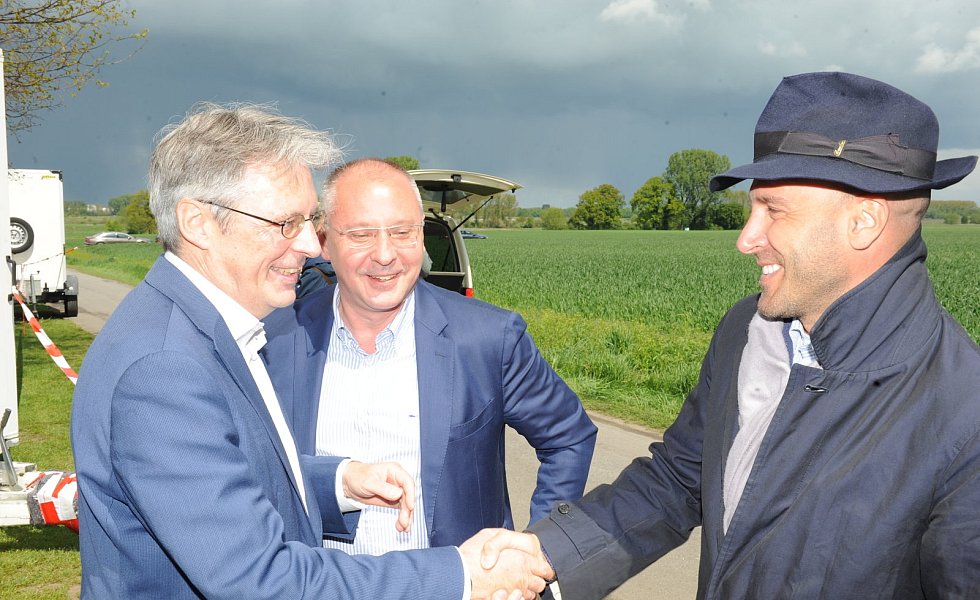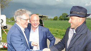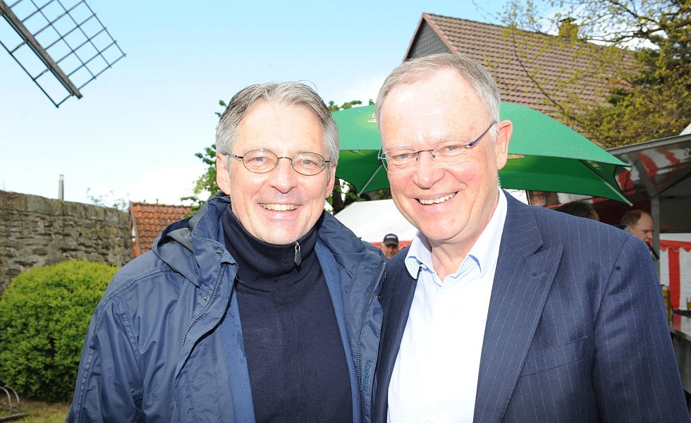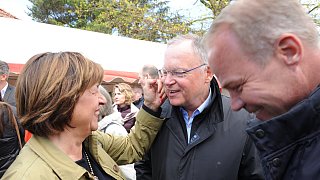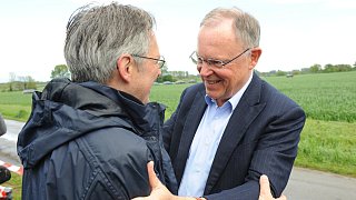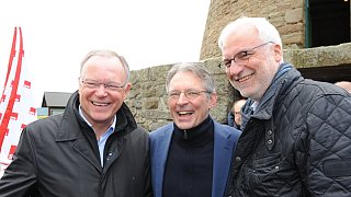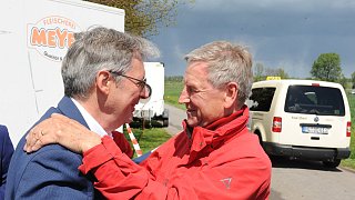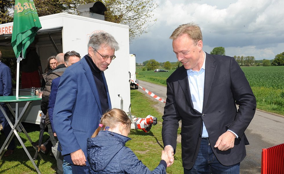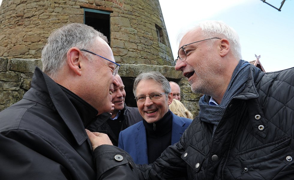 Ausgefallenes Geschenk: In Namen von ostwestfälischen Bundestags- und Landtagsabgeordneten überreichte Stefan Schwartze (l.) Achim Post eine Modellbahn. Gedwimet ist die "Achim, dem Schrecken der Bahnstrecken" und soll ihn an den Kampf gegen die Tunneltrasse durch den Jakobsberg erinnern. Ein Schrecken sei er aber nur für falsche Bahnstrecken, schmunzelte Achim Post.