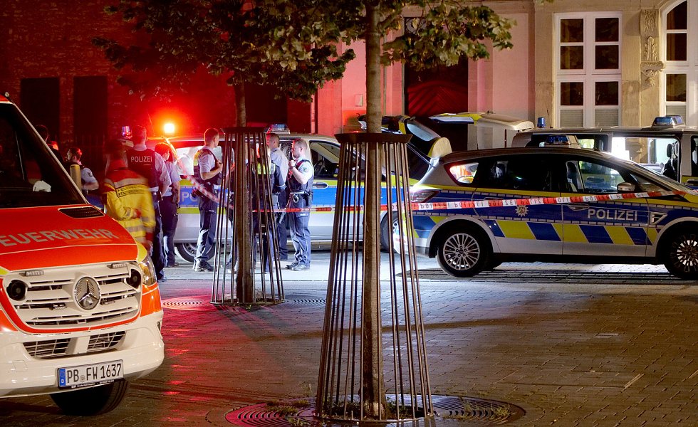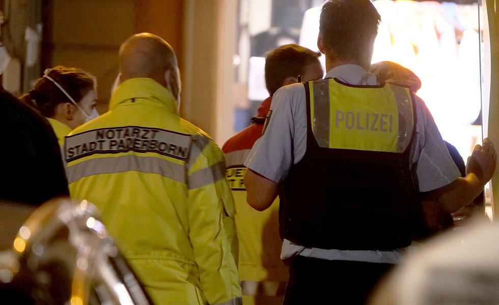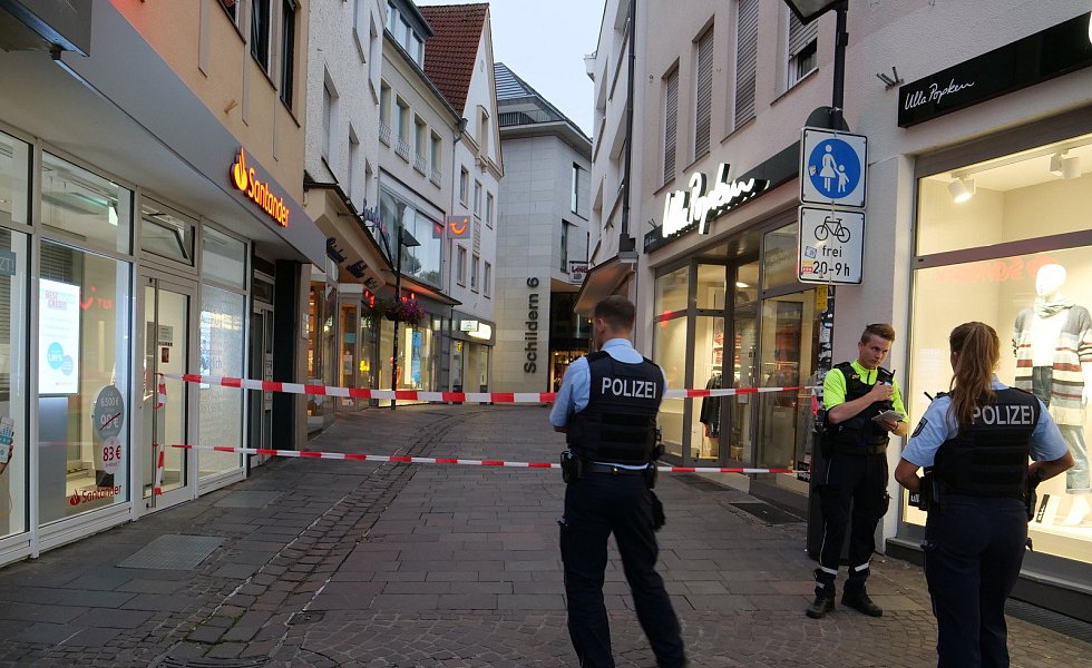 Während der Vorstand der Verbund-Volksbank OWL den glücklichen Ausgang des Polizeieinsatzes diskutieren, wird der 83-Jährige im Rettungswagen medizinisch versorgt.