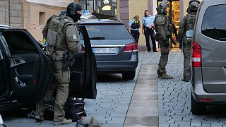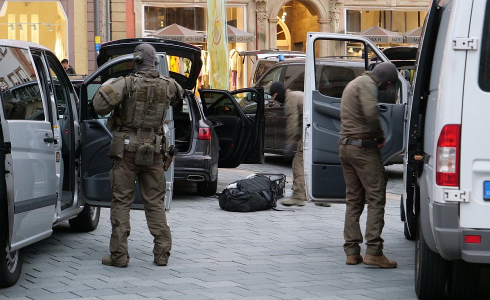 Gemeinsam mit den Spezialkräften rücken die Polizeibeamten durch den Schildern auf die Volksbank vor.