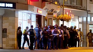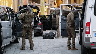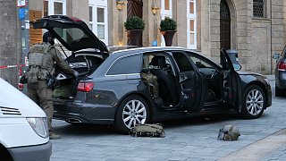 Auf dem Marktplatz rüsten sich die Spezialkräfte der Bielefelder Polizei, die mit elf Fahrzeugen angerückt waren, für den Einsatz im Gebäude der Volksbank.