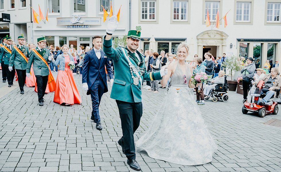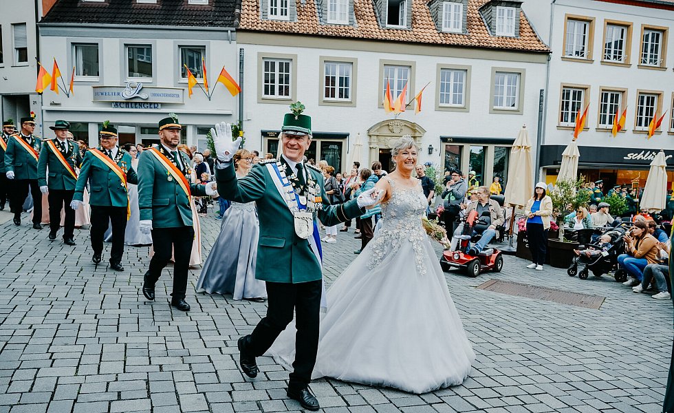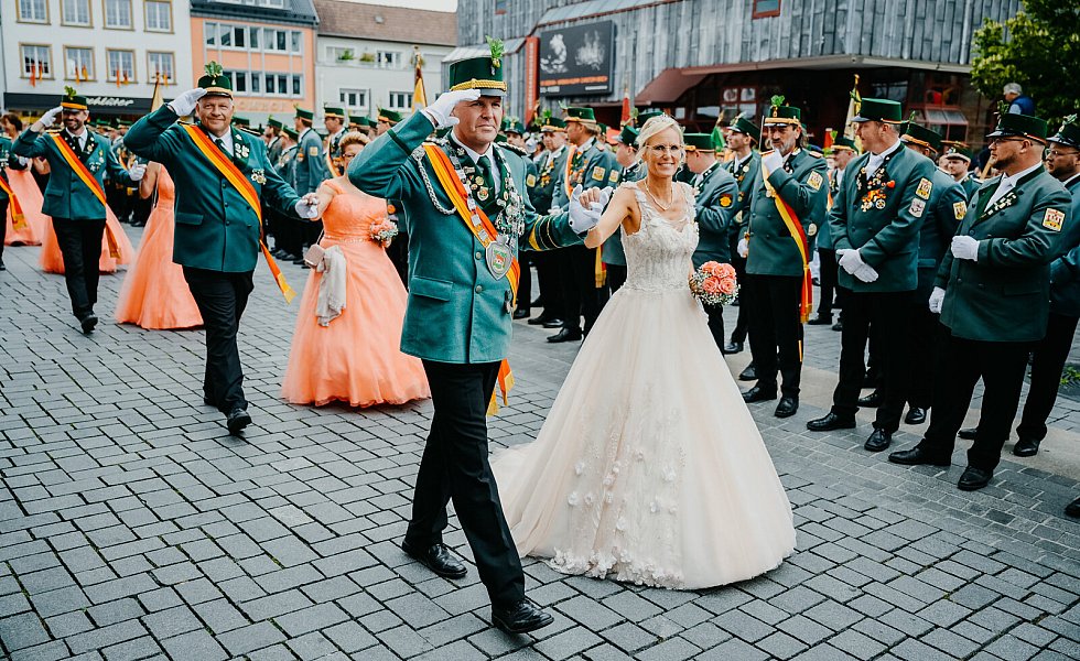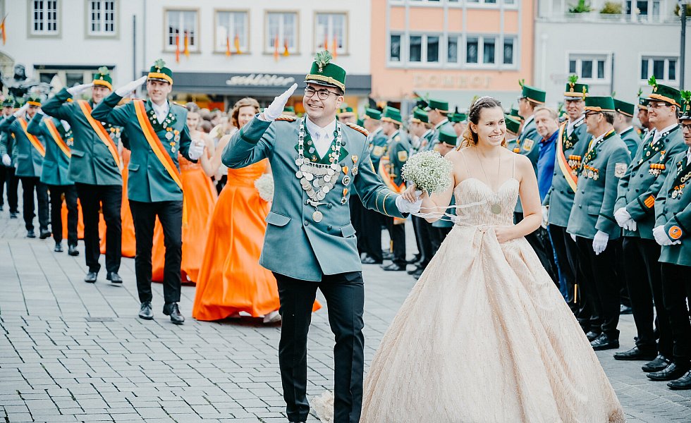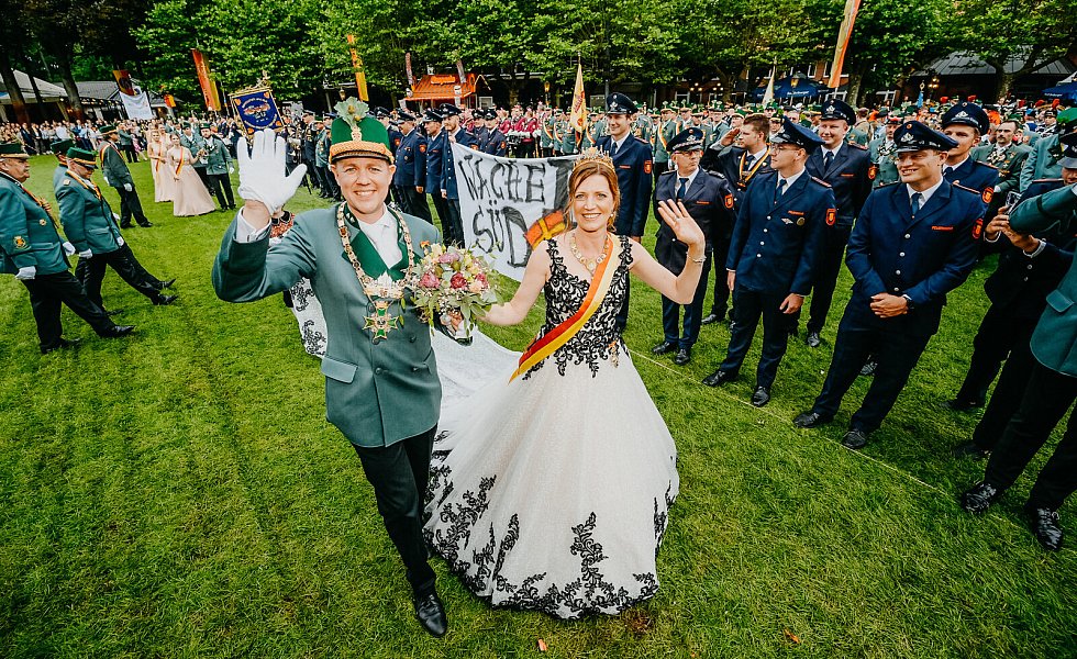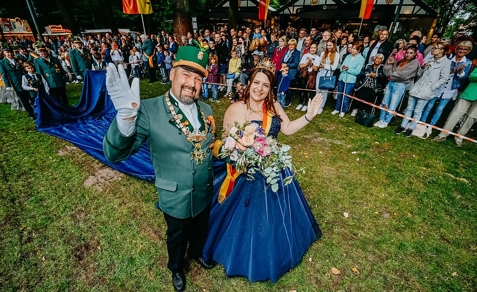 Die beiden Majestäten Dennis Happe und Stefanie Nötges ziehen bei der Parade auf dem Schützenplatz freudestrahlend an den Feuerwehr-Kollegen des Königs vorbei.
