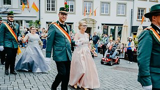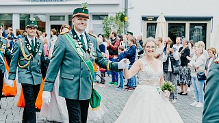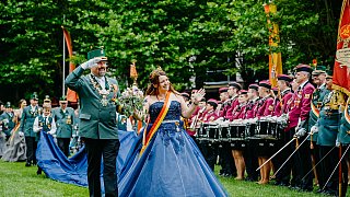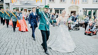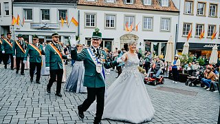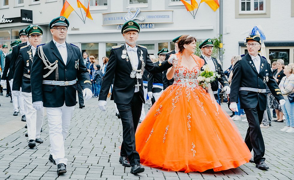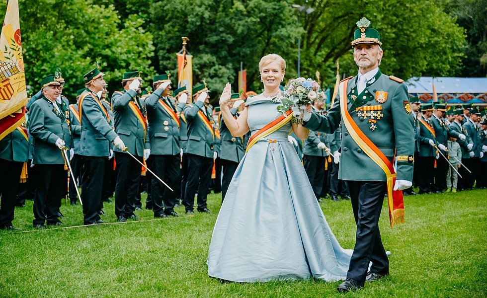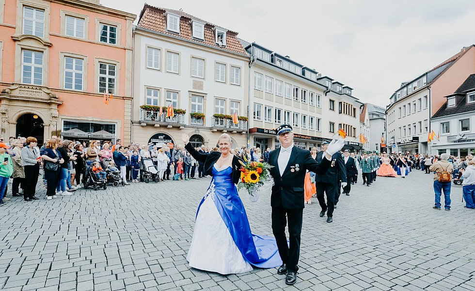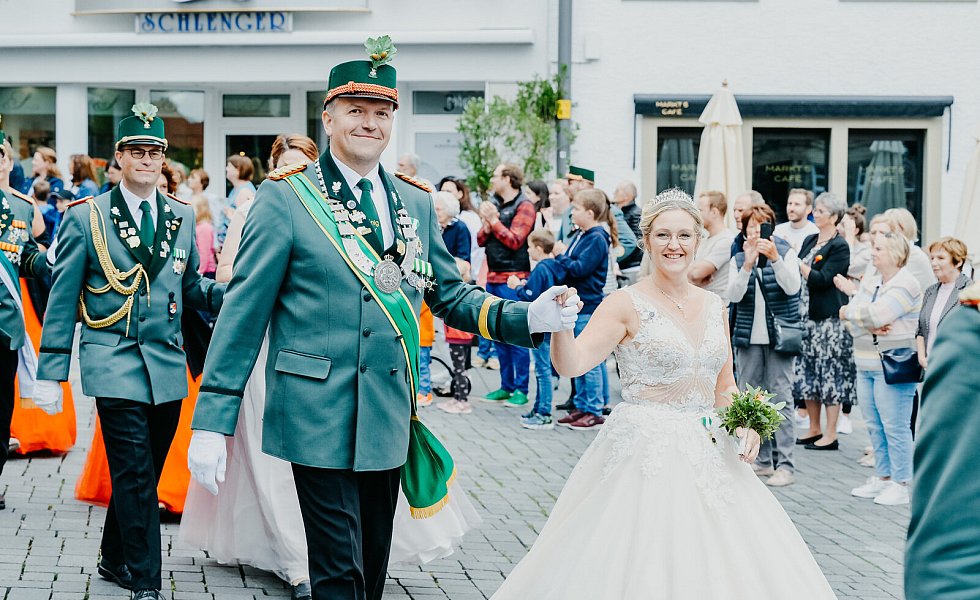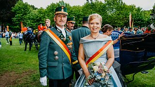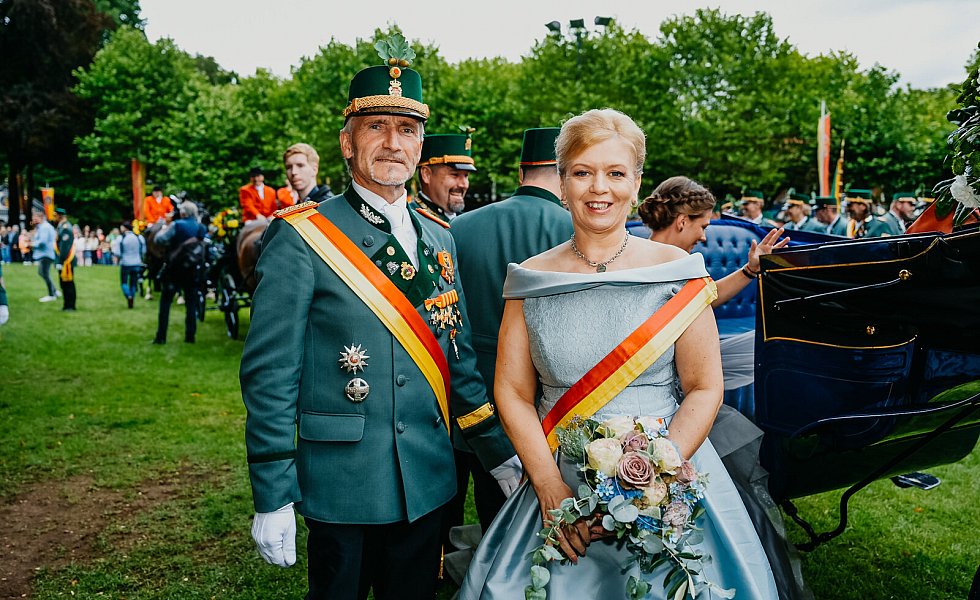Die beiden Majestäten Dennis Happe und Stefanie Nötges ziehen bei der Parade auf dem Schützenplatz freudestrahlend an den Feuerwehr-Kollegen des Königs vorbei.