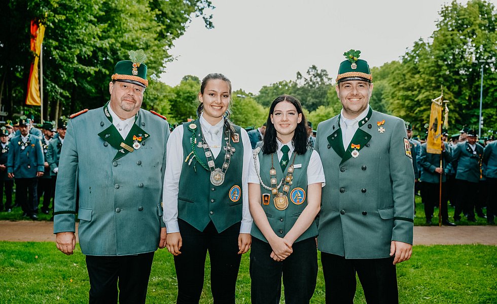 Jugendprinzessin Carlotta Holtey (2.v.l.) und Schülerprinzessin Franziska Müller mit Leutnant Michael Bröckling (l.) und Sergeant Alexander Mönikes, die mit dem Jugendverdienstorden ausgezeichnet wurden.