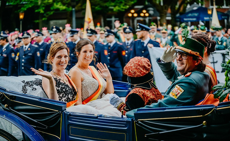 Königin Stefanie Nötges (l.) und Zeremonienmeisterin Silke Wasmuth bei der Auffahrt auf den Schützenplatz.