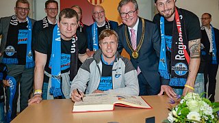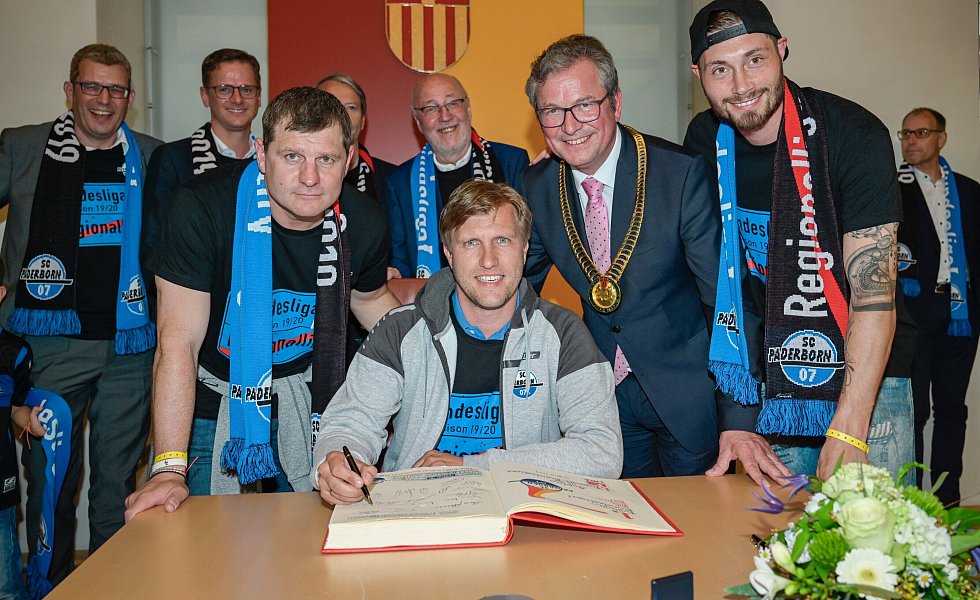 Mit Steffen Baumgart, Markus Krösche und Christian Strohdiek nach dem SCP-Bundesligaaufstieg im Jahr 2019.