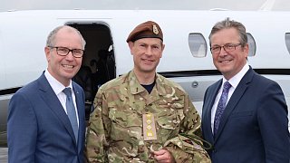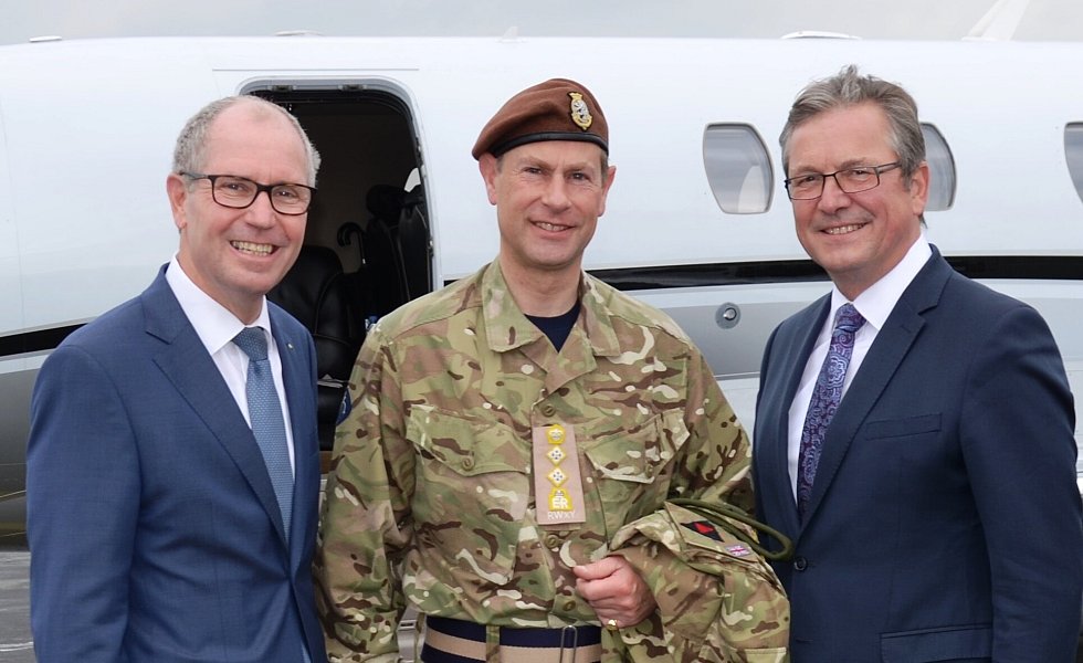 Mit Prince Edward und Landrat Manfred Müller im Jahr 2017 auf dem Rollfeld des Flughafens.