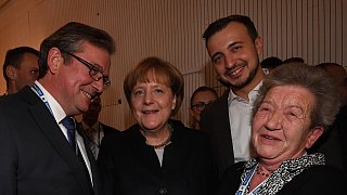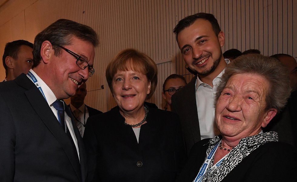 Michael Dreier mit Angela Merkel, Paul Ziemiak und Mutter Wilma Dreier beim Deutschlandtag der Jungen Union 2016.