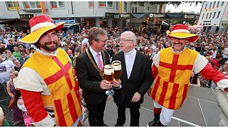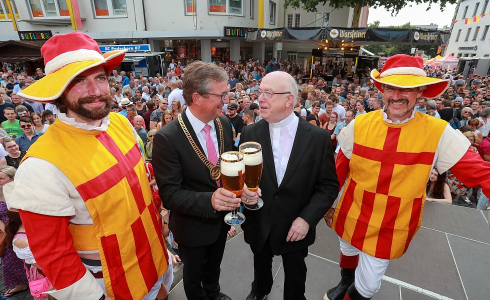 Am ersten Liborisamstag 2018 eröffnet Michael Dreier mit Erzbischof Hans-Josef Becker und den Jubelhennessen Gordon Leukel (l.) und Uwe Brieler die Festwoche.