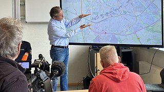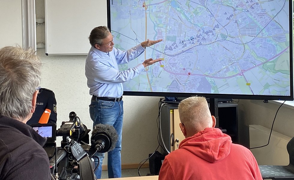 Michael Dreier erläutert 2022 anhand der Einsatzkarte, welche Schneise der Tornado durch die Stadt gefräst hat.