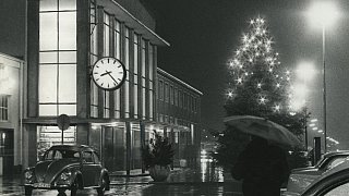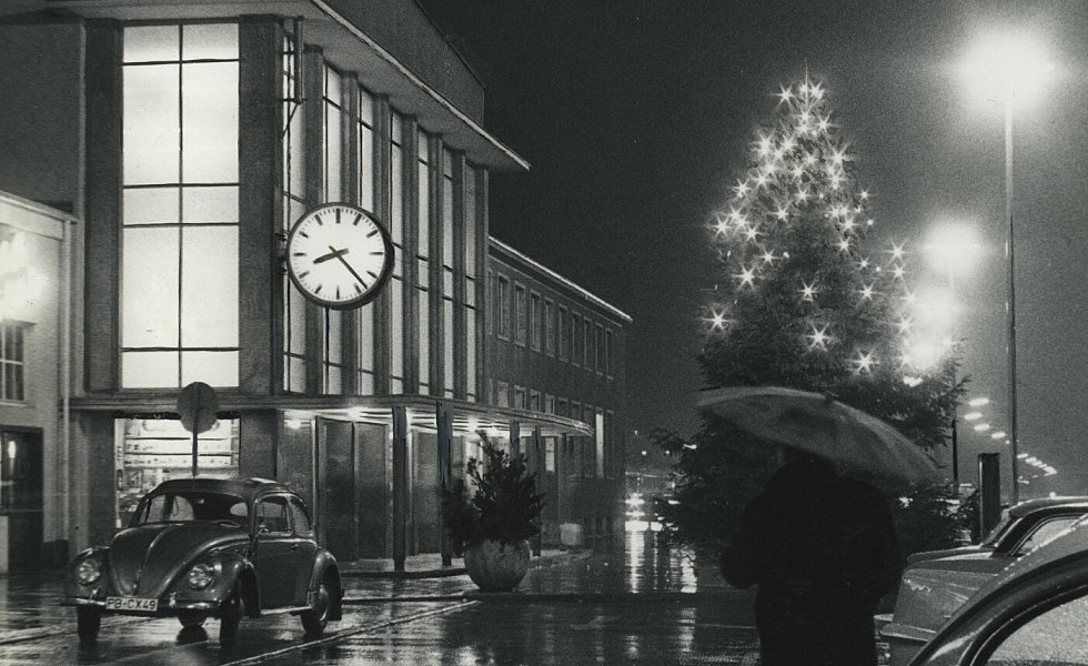In der Weihnachtszeit 1964 steht vor dem Hauptbahnhof ein beleuchteter Nadelbaum.