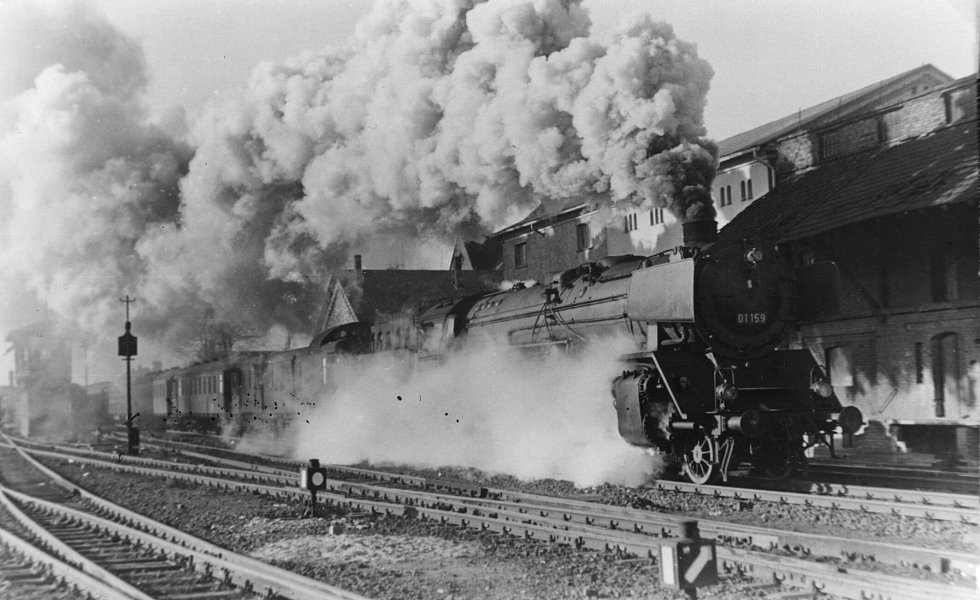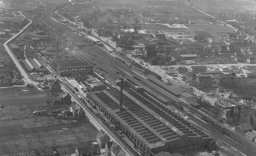 Auf dieser Übersichtsaufnahme aus dem Jahr 1959 sind im hinteren Bereich ein damailiger runder und ein halbrunder Lokschuppen zu sehen.