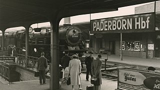 Eine Lokomotive unter viel Dampf im Hauptbahnhof Paderborn, links entschwindet das Stellwerk.
