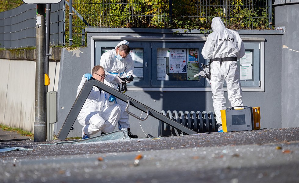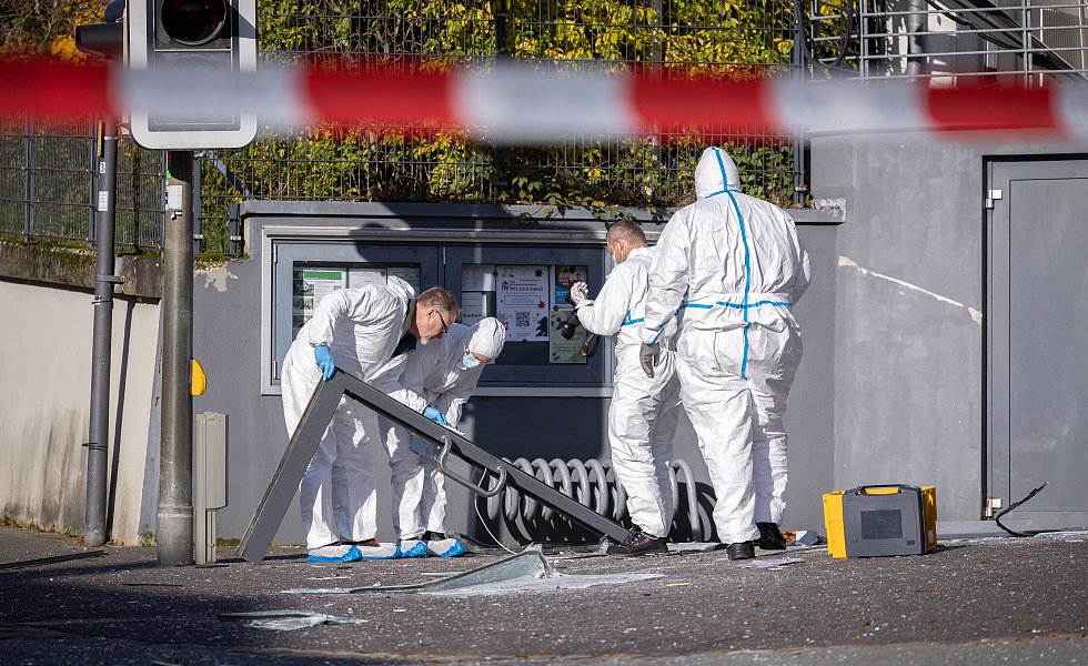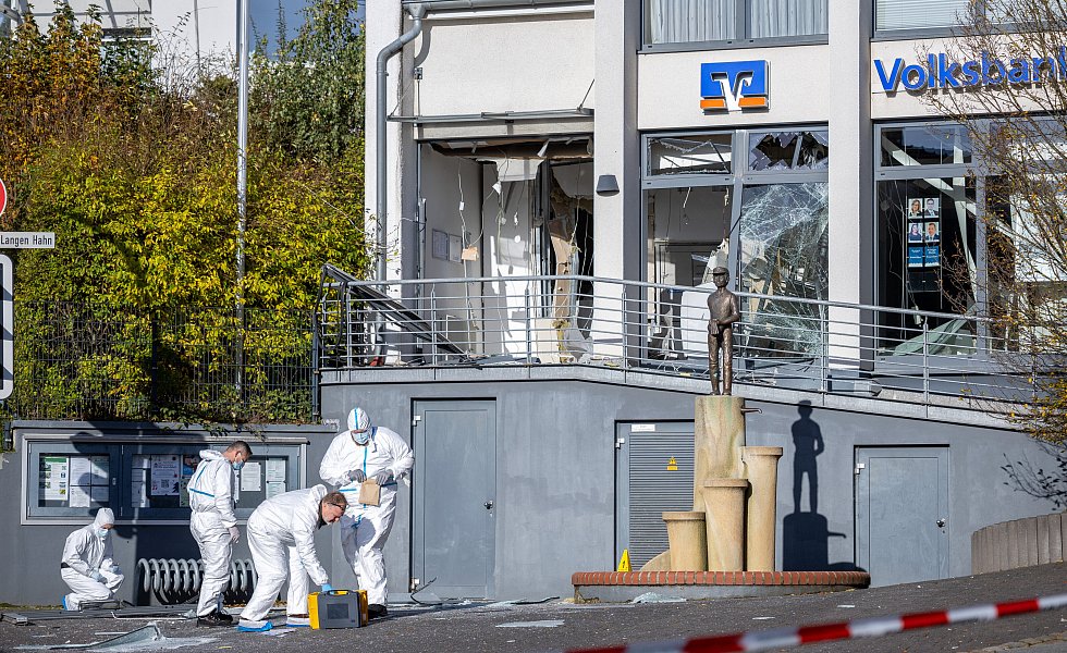 Mitarbeitende der Bielefelder Polizei sichern an der Volksbank in Paderborn-Dahl Spuren.