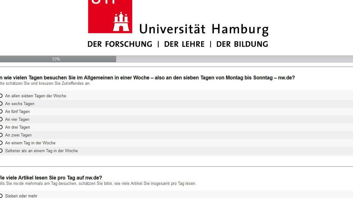 Im Rahmen seiner wissenschaftlichen Abschlussarbeit an der Universität Hamburg untersucht Alexander Drößler, wie zufrieden Sie mit den Inhalten auf unserer Internetseite nw.de sind. Er freut sich, wenn Sie sich etwa zehn Minuten für seine Online-Umfrage nehmen. Unter allen Teilnehmenden werden fünf Amazon-Gutscheine im Wert von 10 Euro verlost.