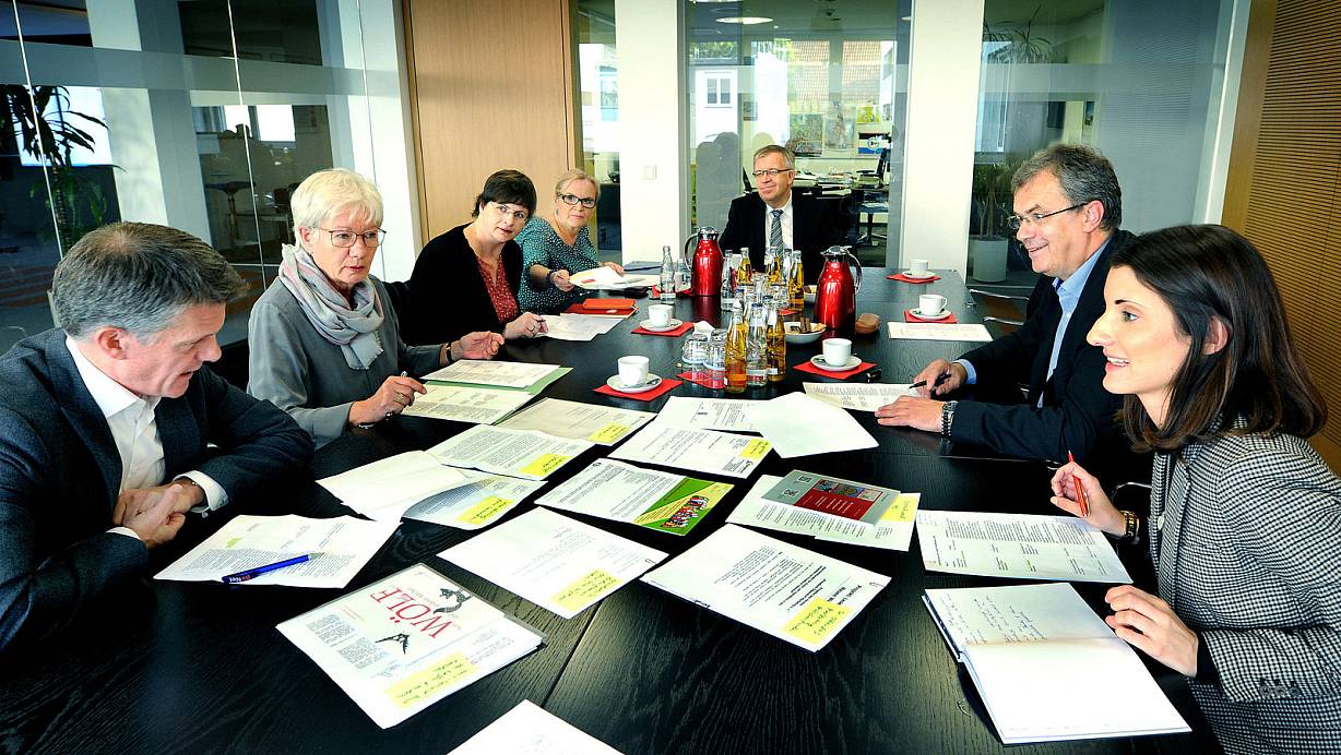 Trafen die Auswahl (v. l.): Die Jurymitglieder Markus Harbaum (Bertelsmann), Gabriele Behler, Susan Kreller, Sabine Lipan, Pastor Ulrich Pohl, NW-Chefredakteur Thomas Seim und Redakteurin Sandra Spieker. | © Andreas Fruecht