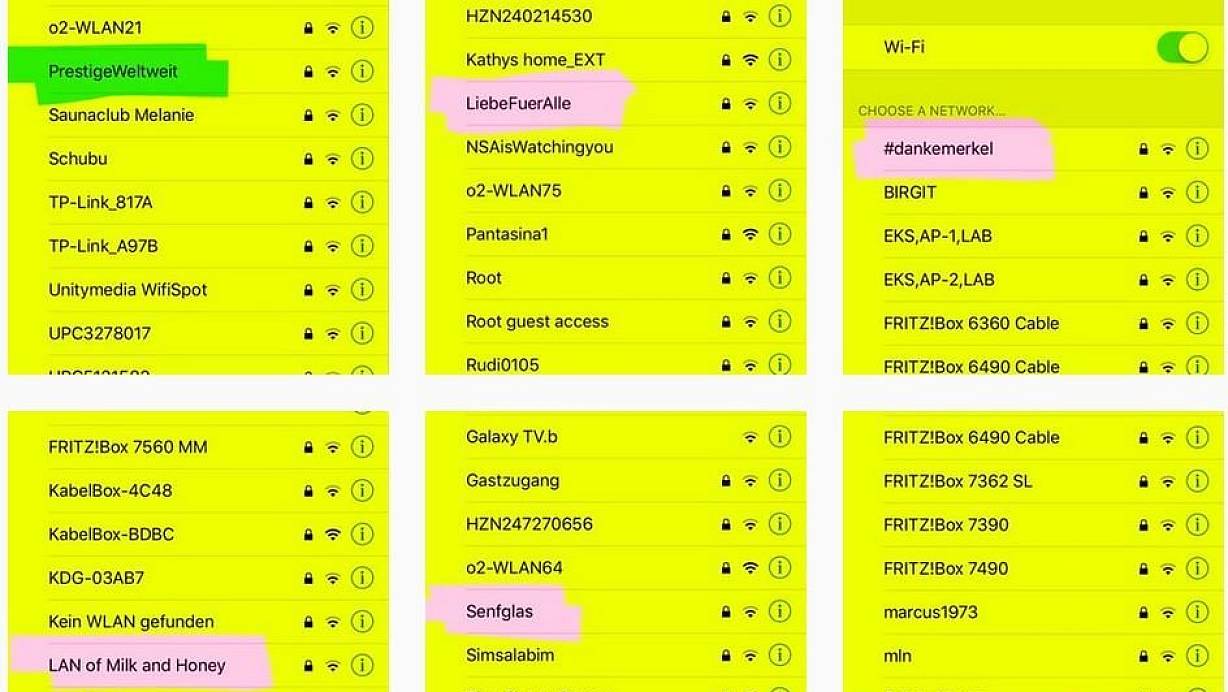 In 13 deutschen Städten sammelte sie 2.400 WLAN-Netz-Namen, darunter in Münster, Dortmund, Düsseldorf und Köln – von „Die miese Stiefschwester", über „Adorno" bis hin zum unkaputtbaren Klischee „Bielefeld gibt es nicht" – ein Fundstück aus dem Belgischen Viertel in Köln.