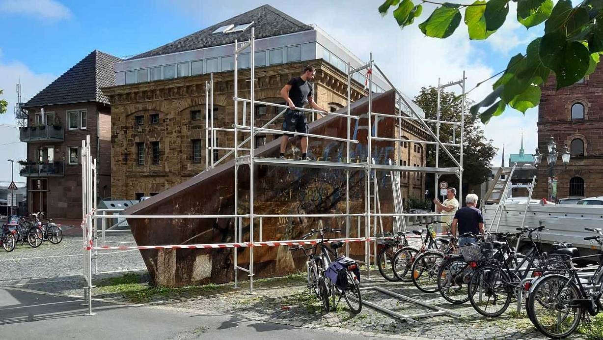 Wilfried Hageböllings „Keilstück“ erhält einen Graffitischutz und wird gesandstrahlt. Der Künstler hatte zuvor ein Ultimatum gesetzt.