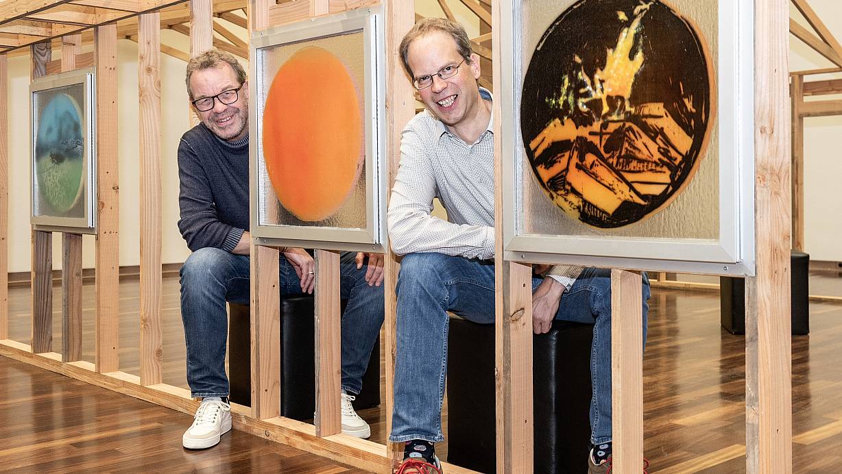 Paderborns Citymanager Heiko Appelbaum (r.) und NW-Kulturchef Stefan Brams vor dem Gespräch in Oscar Tuazons Holzhaus in der Bielefelder Kunsthalle. | © Jörg Dieckmann