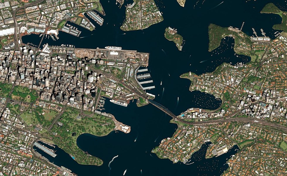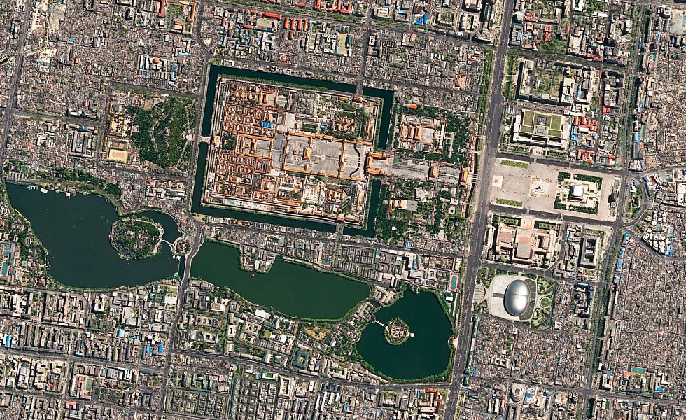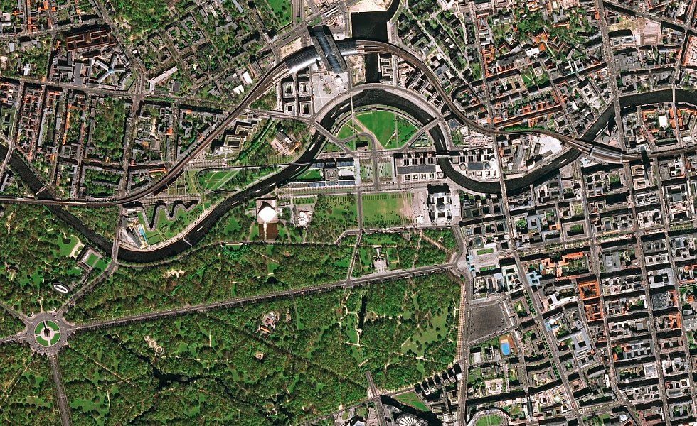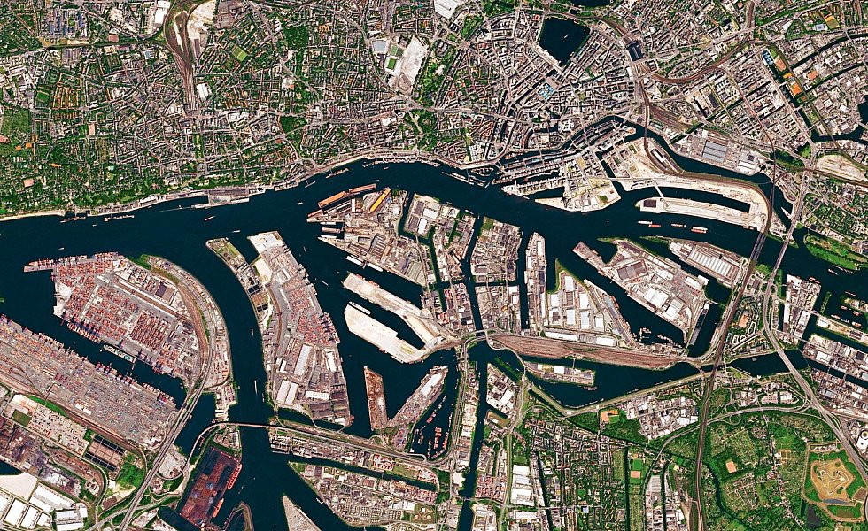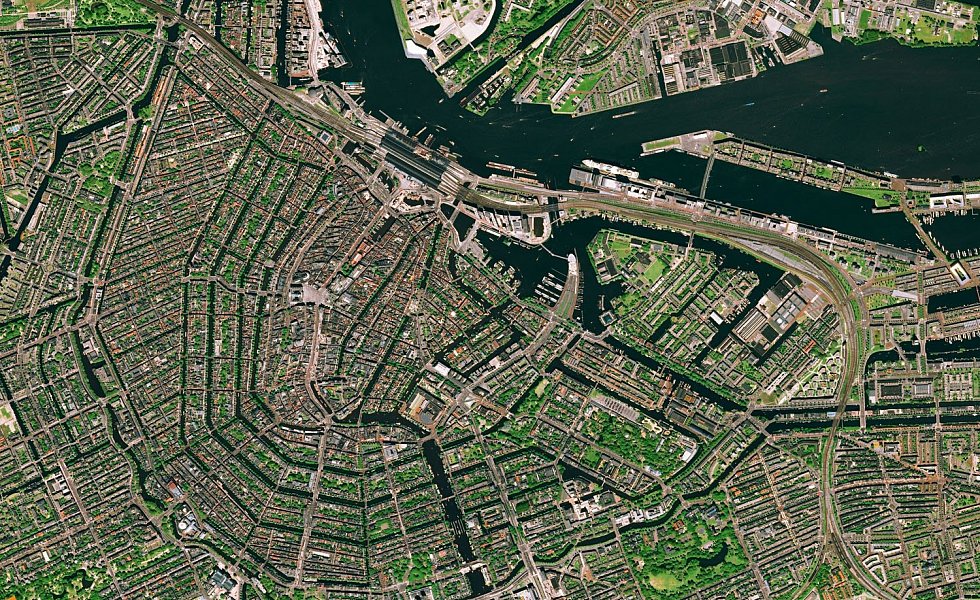 Die Bilder aus dem All – Deutschland ist mit Berlin, Hamburg, Ludwigshafen und Karlsruhe vertreten – lassen Adern und Organe des Lebewesens Stadt wie bei einer Röntgenaufnahme hervortreten: die Hauptstraßen, Bahnhöfe, Flughäfen, Häfen, die grünen Lungen. Die meisten Bilder stammen vom Satelliten Pleiades des europäischen Unternehmens Airbus, einem der führenden Hersteller und Betreiber von Erdbeobachtungssatelliten. Dieser Satellit fliegt auf einer Höhe von knapp 700 Kilometern.