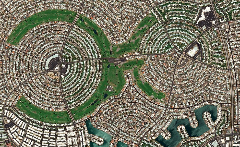 Wie Kunstobjekte wirken Städte, die komplett am Reißbrett entworfen wurden. Die Rentnerzuflucht Sun City in Arizona, wo nur Menschen über 55 Jahre wohnen, ist aus sauber gezirkelten Straßenkreisen mit abgesenkten Bordsteinen zusammengesetzt. Einzigartige künstliche Muster bilden auch die Siedlungen von Boca Raton im Süden Floridas oder die künstlichen Inselwelten der arabischen Planstädte Doha und Durrat Al-Bahrain.